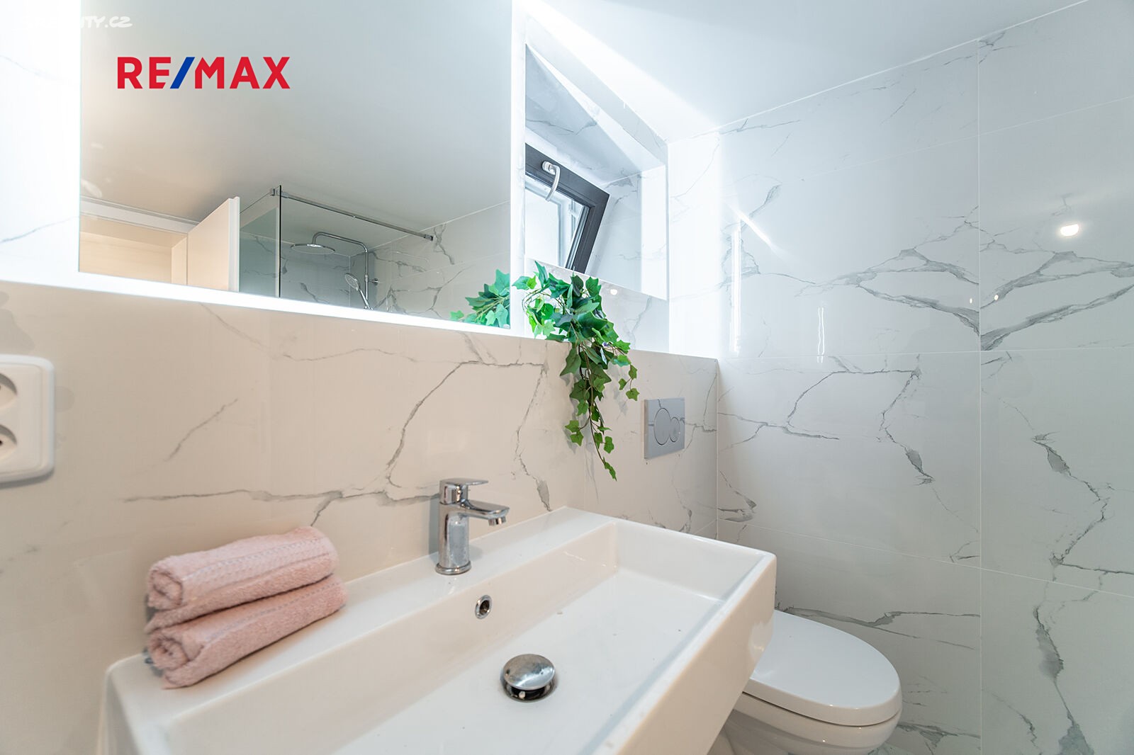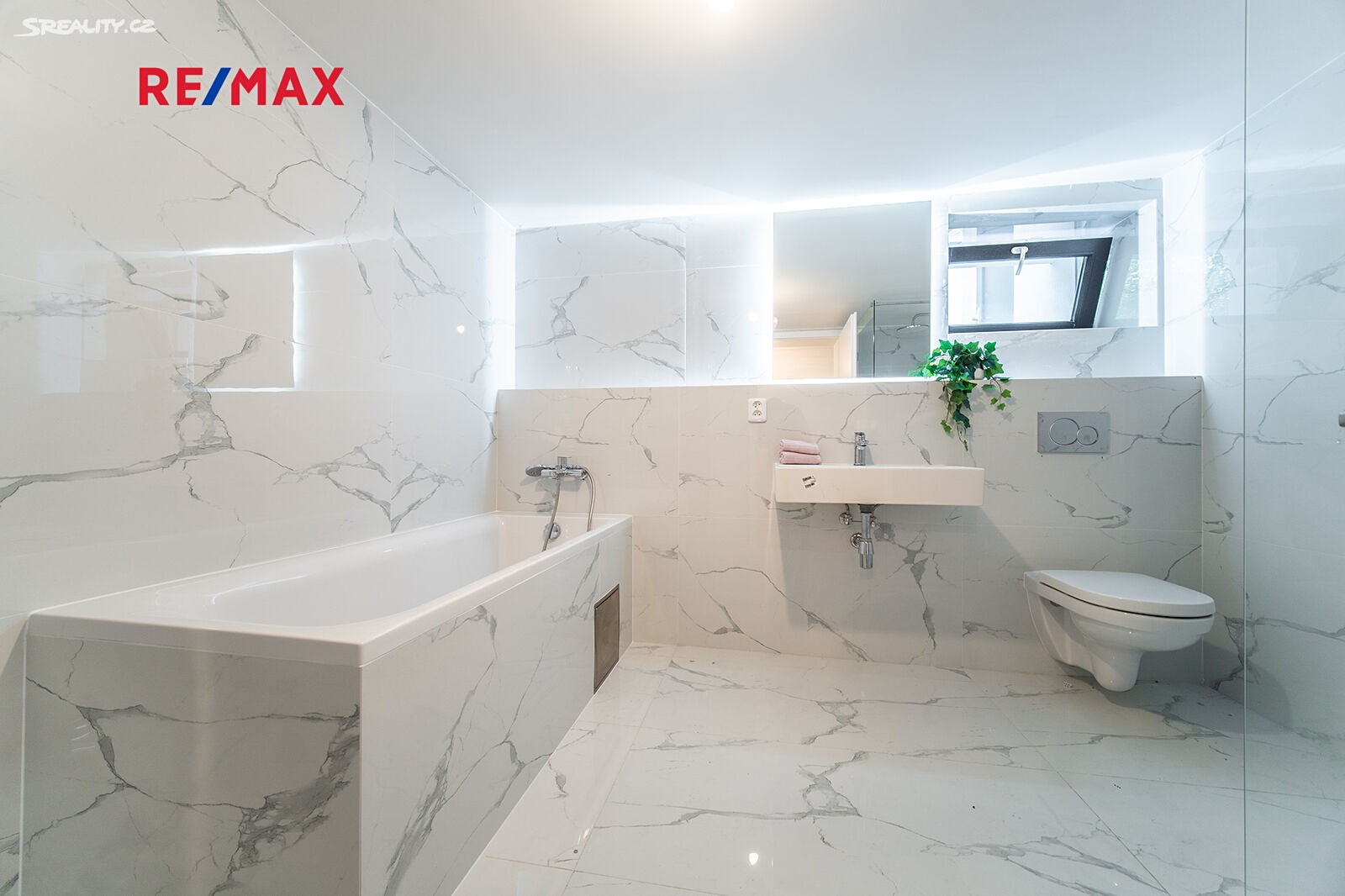 Designově moderní koupelna vás nadchne! Obklady i dlažba jsou v designu mramoru, osvětlení zrcadla, vana i velký sprchový kout s moderní sanitou jen doladí pocit luxusu a pohodlí.