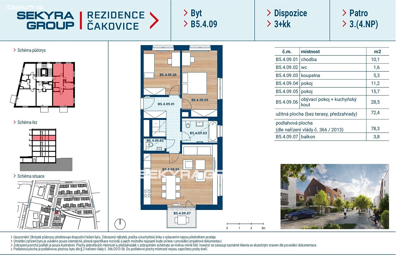 Dovolujeme si Vám nabídnout k prodeji byt 3+kk o výměře 78,3 m² s balkónem 3,8 m² v rezidenčním projektu Rezidence Čakovice, etapa B