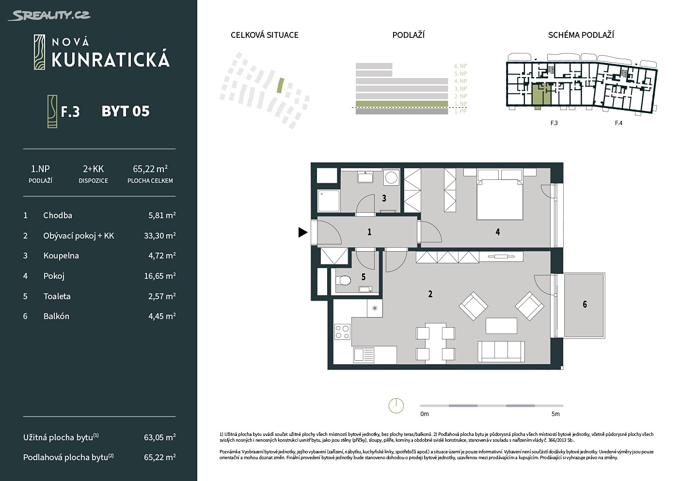 Tento nový byt č. F3.1.05 o dispozici 2+kk (63,05 m2) s balkónem (4,45 m2) se nachází v 1. podlaží budovy F3F4 na Nové Kunratické.