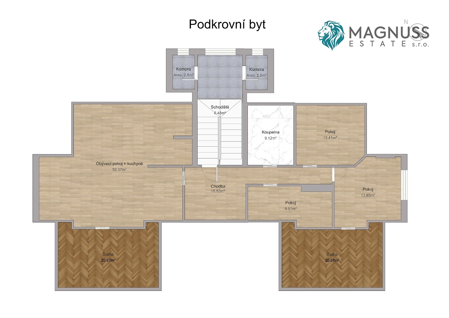 Byt nabízí velkorysý obytný prostor s možností individuálního doladění dle vlastních představ. Součástí bytové jednotky jsou také dvě samostatné šatny o výměře 20 m², sklep v suterénu domu (20 m²) a dvě komory na patře, které poskytují dostatek úložného místa.