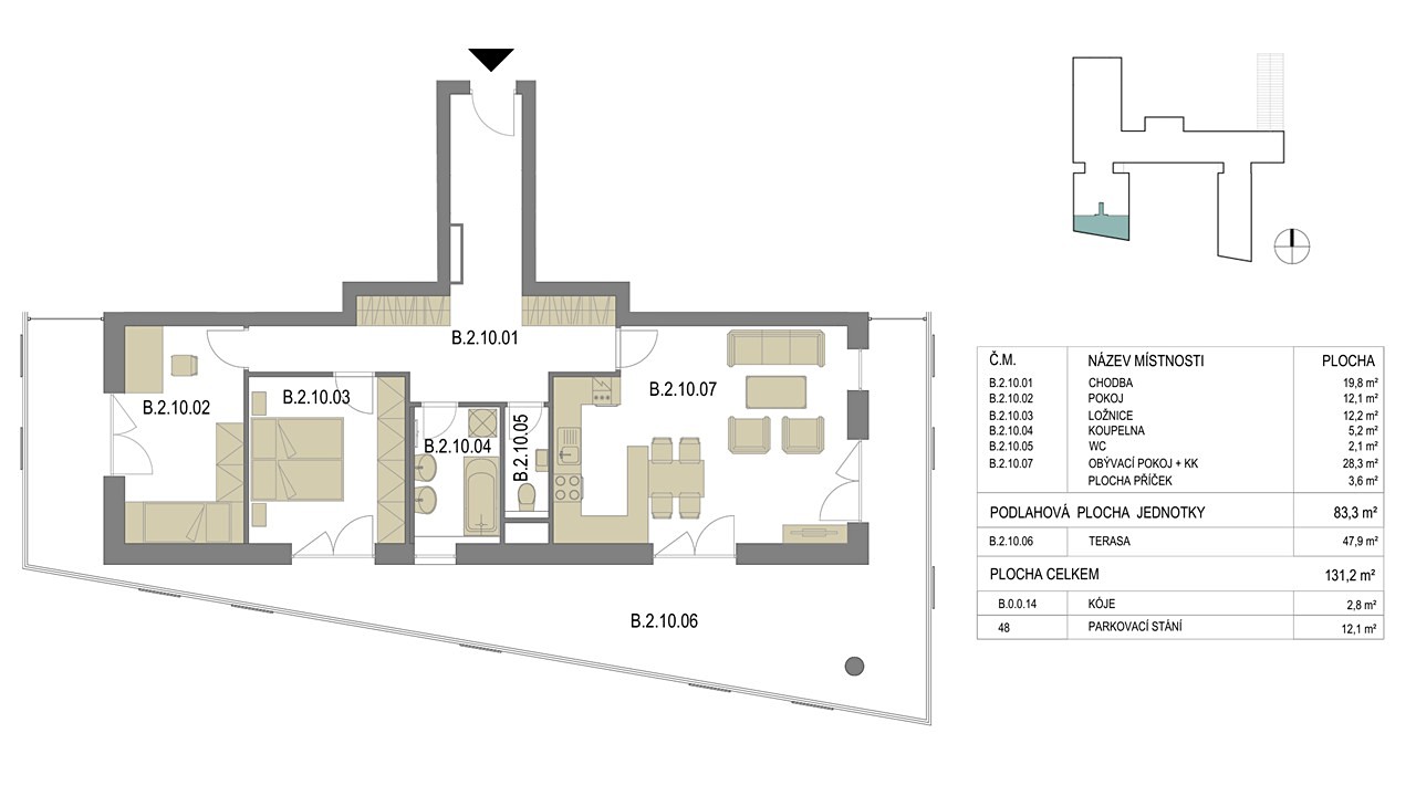Tento byt o užitné ploše 83 m², doplněný o velkorysou terasu o rozloze 48 m², představuje ideální spojení prostoru, soukromí a moderního komfortu. Již při vstupu je patrné, že se nejedná o běžnou nemovitost – veškeré vybavení bylo navrženo a vyrobeno na zakázku, s důrazem na detail, funkčnost a nadčasový design. Každý prvek interiéru byl promyšlen tak, aby vytvořil harmonický a reprezentativní celek.