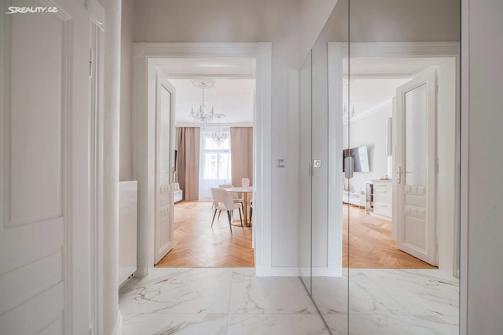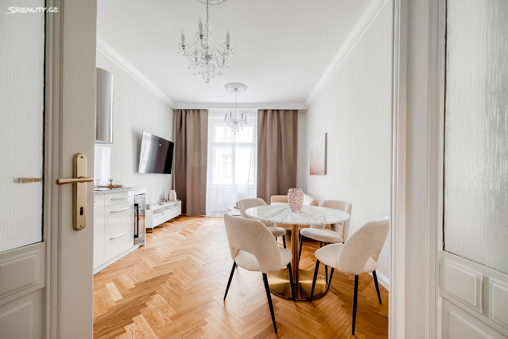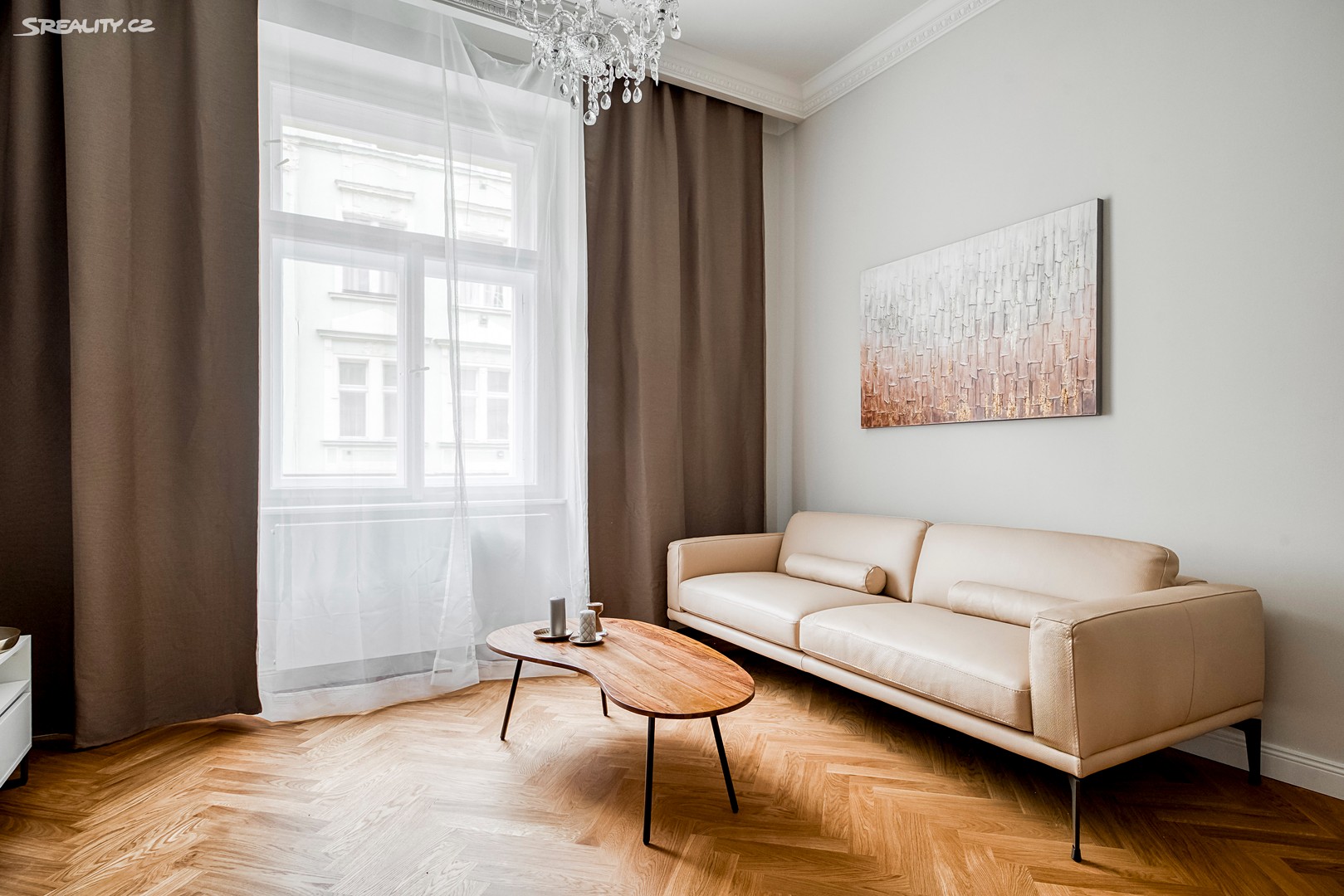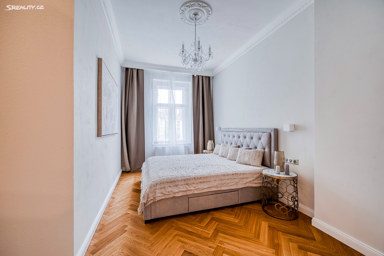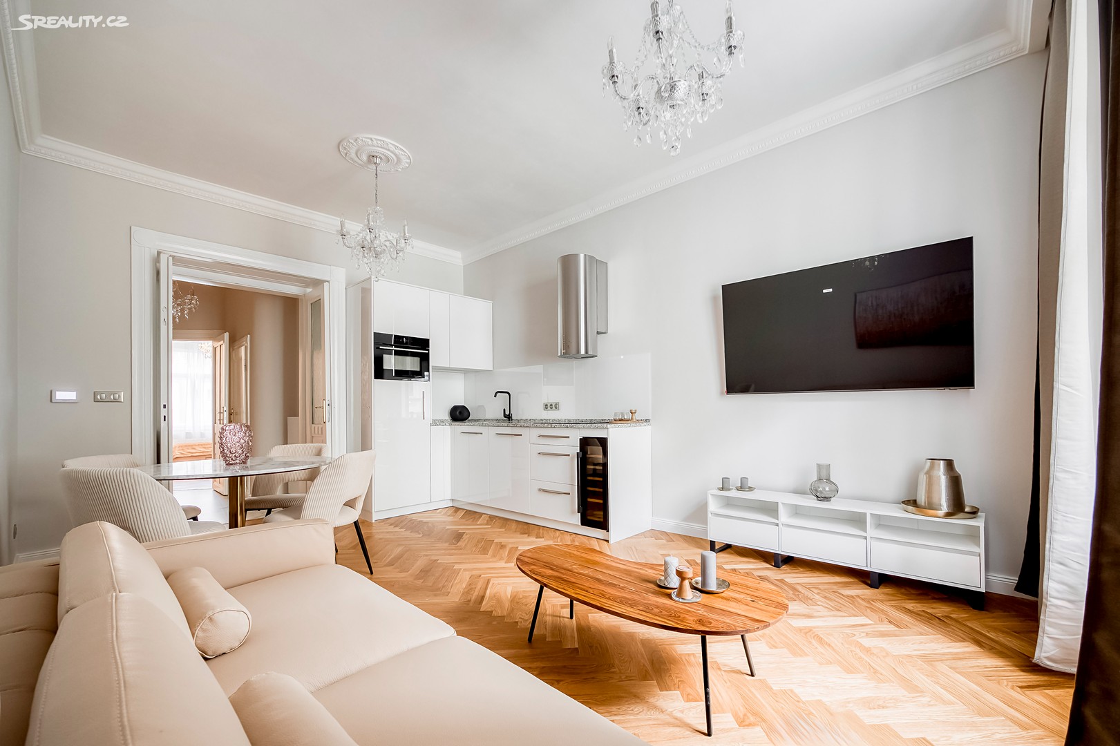 Byt nabízí: Světlý obývací pokoj s plně vybaveným kuchyňským koutem (pracovní deska z žuly Bianco Sardo, spotřebiče BOSCH, vinotéka). Hlavní ložnice s možností vytvoření šatny. Moderní koupelna se sprchovým koutem typu walk-in, toaletou a umyvadlem Villeroy & Boch, veškerá armatura značky Hansgrohe. Prostorná předsíň s velkou vestavěnou skříní a pračkou. Byt disponuje dřevěnými špaletovými okny, 3 m vysokými stropy s krásnými štukovými detaily a dalšími řemeslnými prvky, které zachovávají autentický charakter domu. Vytápění zajišťuje elektrický kotel Protherm a nová dubová masivní podlaha dodává bytu teplo a eleganci. K bytu náleží také sklep o velikosti 3,14 m².