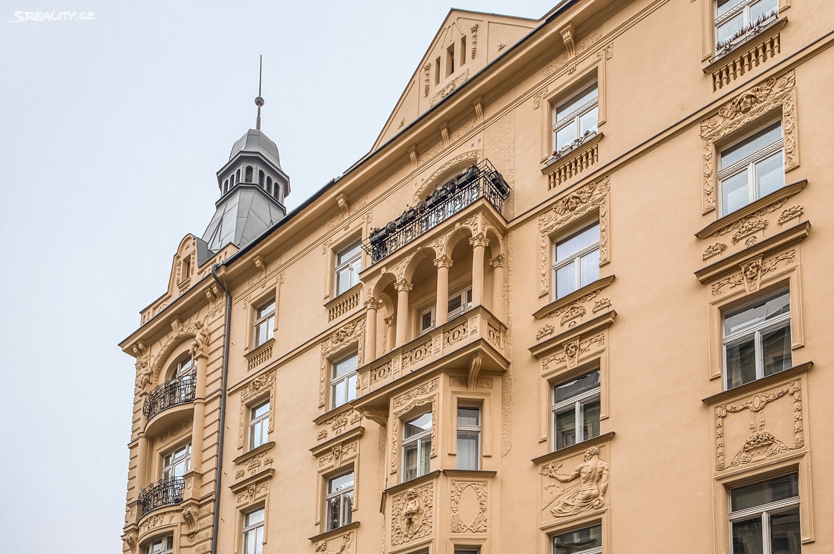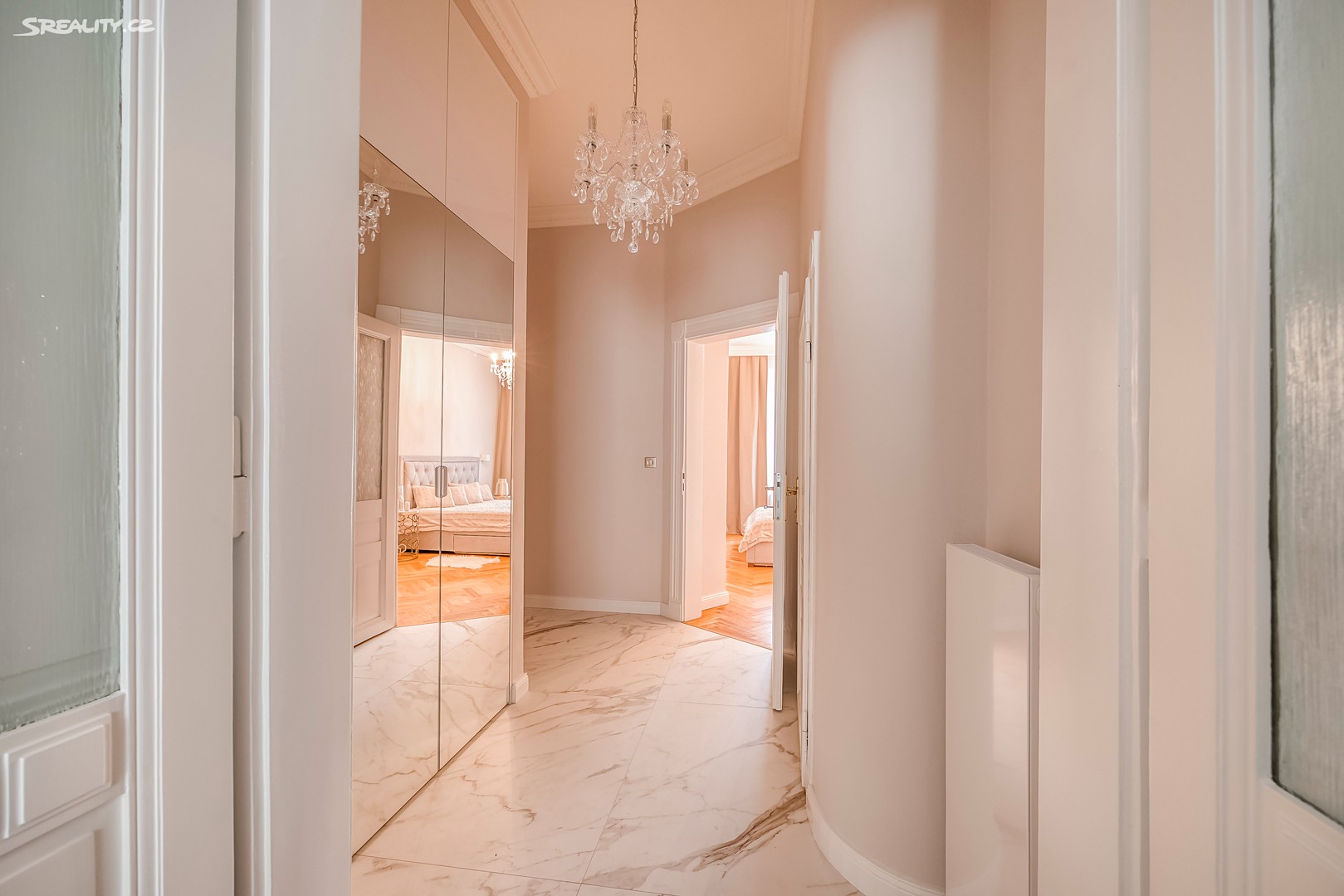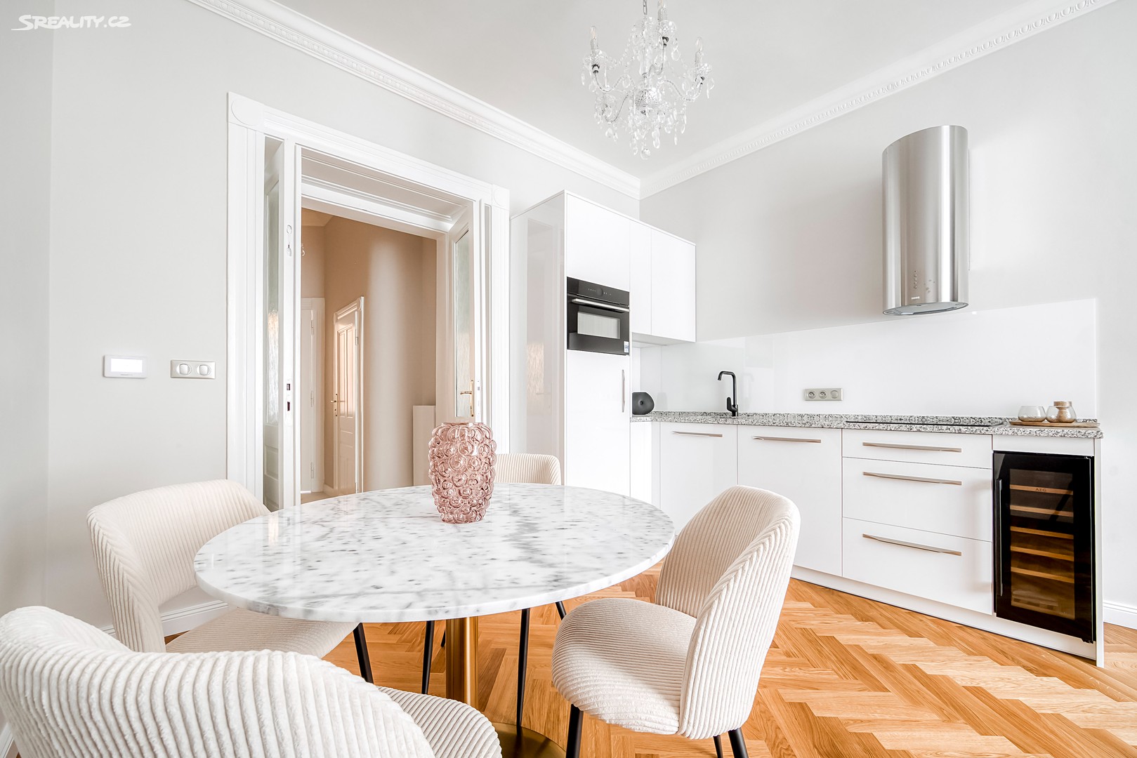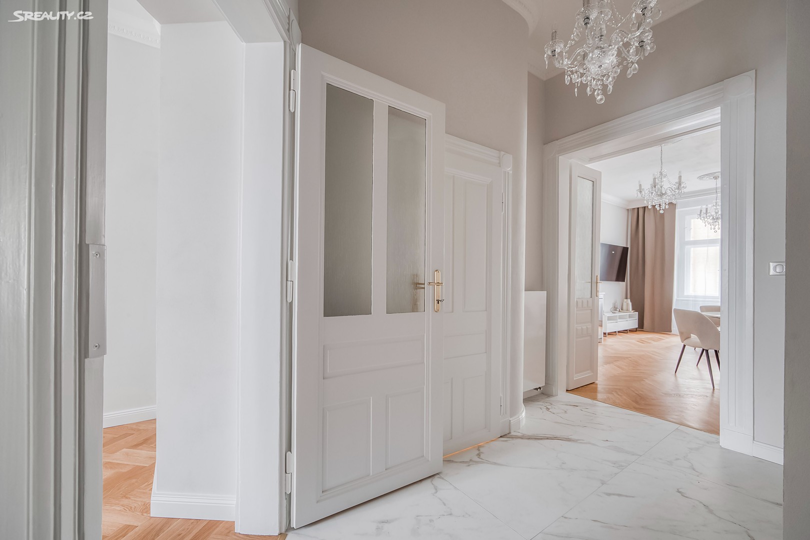 Byt nabízí: Světlý obývací pokoj s plně vybaveným kuchyňským koutem (pracovní deska z žuly Bianco Sardo, spotřebiče BOSCH, vinotéka). Hlavní ložnice s možností vytvoření šatny. Moderní koupelna se sprchovým koutem typu walk-in, toaletou a umyvadlem Villeroy & Boch, veškerá armatura značky Hansgrohe. Prostorná předsíň s velkou vestavěnou skříní a pračkou. Byt disponuje dřevěnými špaletovými okny, 3 m vysokými stropy s krásnými štukovými detaily a dalšími řemeslnými prvky, které zachovávají autentický charakter domu. Vytápění zajišťuje elektrický kotel Protherm a nová dubová masivní podlaha dodává bytu teplo a eleganci. K bytu náleží také sklep o velikosti 3,14 m².