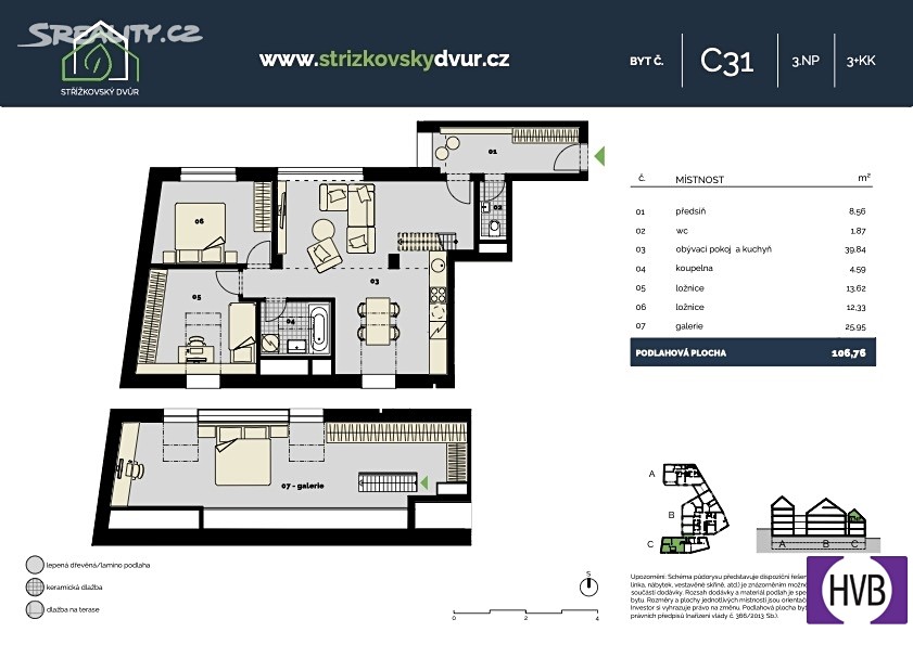 Nabízíme k prodeji byt v osobním vlastnictví o dispozici 3+kk s galerií, o výměře 81 m² + galerie 26 m², ve 3. NP novostavby v projektu Střížkovský dvůr, Praha 8 – Střížkov.