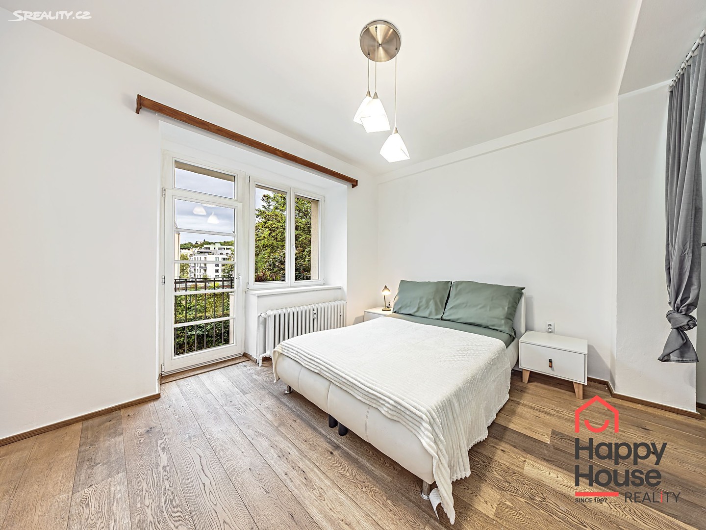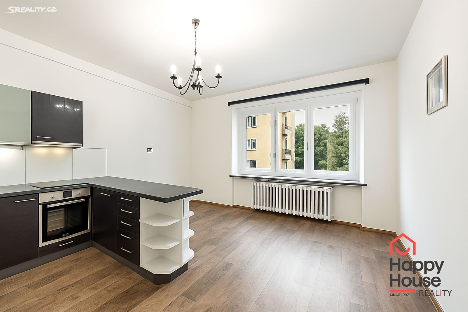 Výhled z obývacího pokoje je orientován na západ do ulice, pohled z ložnice a balkónu na východ do klidného vnitrobloku se vzrostlou zelení.