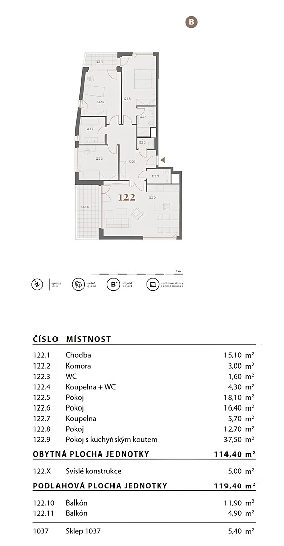 Nabízíme k prodeji jedinečný byt s dispozicí 4+kk o podlahové ploše 119 m², doplněný o 2 balkony (celkem 17 m²), sklep a 3 prostorná garážová stání v ceně – tento příjemný benefit výrazně zvyšuje hodnotu nemovitosti a usnadňuje každodenní život. Světlý a prostorný byt se nachází v moderní rezidenční budově s výtahem projektu Bydlení Brâník od Trigemy