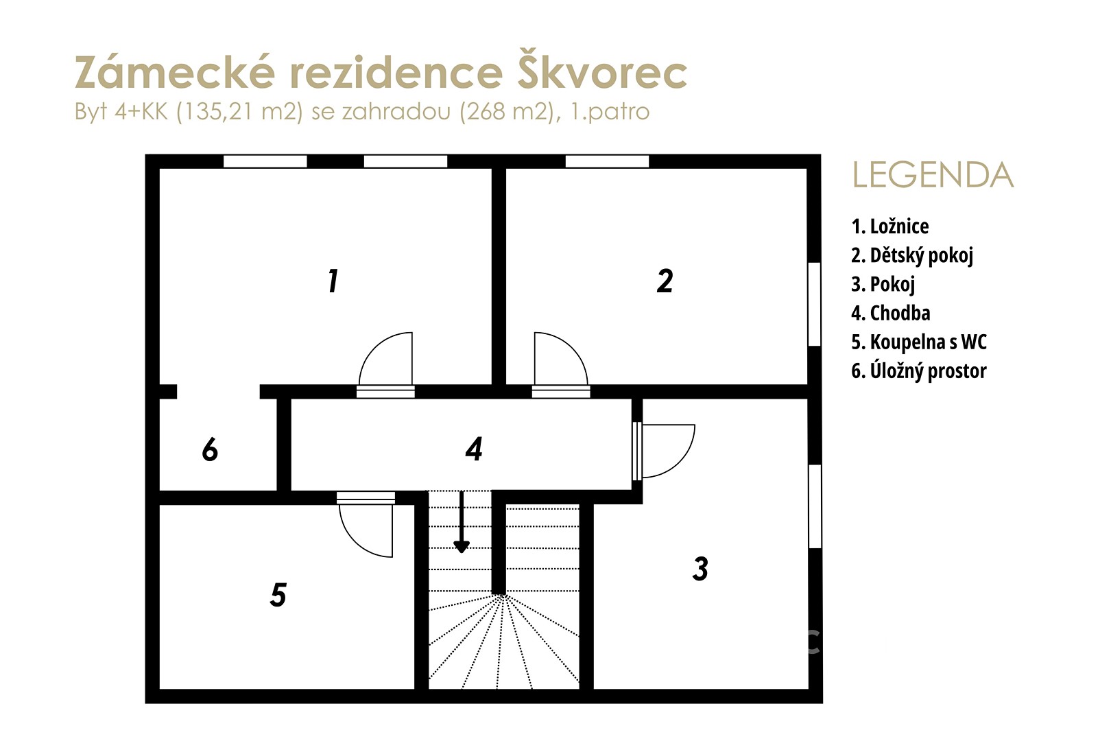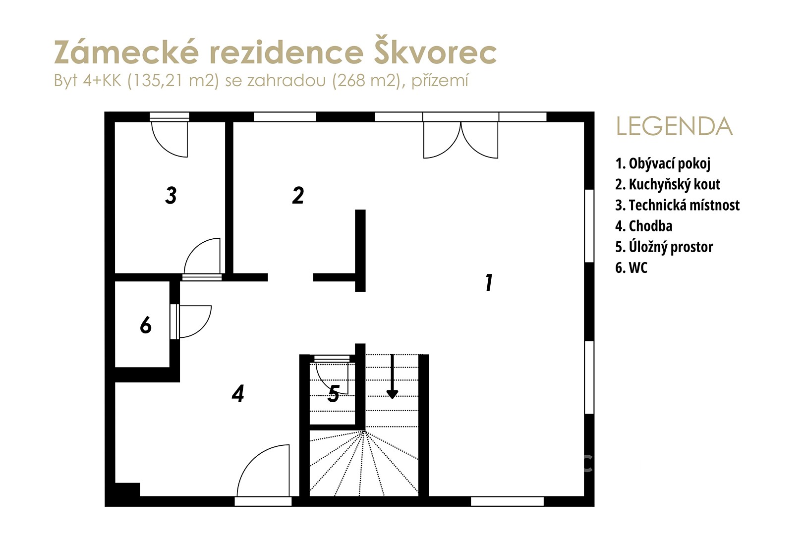 Nabízíme vám byt o dispozici 4+kk s podlahovou plochou 135 m², který se nachází v nově vznikajícím rezidenčním projektu Zámecké rezidence Škvorec. K bytu náleží zahrada o velikosti 268 m², garážové stání a venkovní parkovací místo.