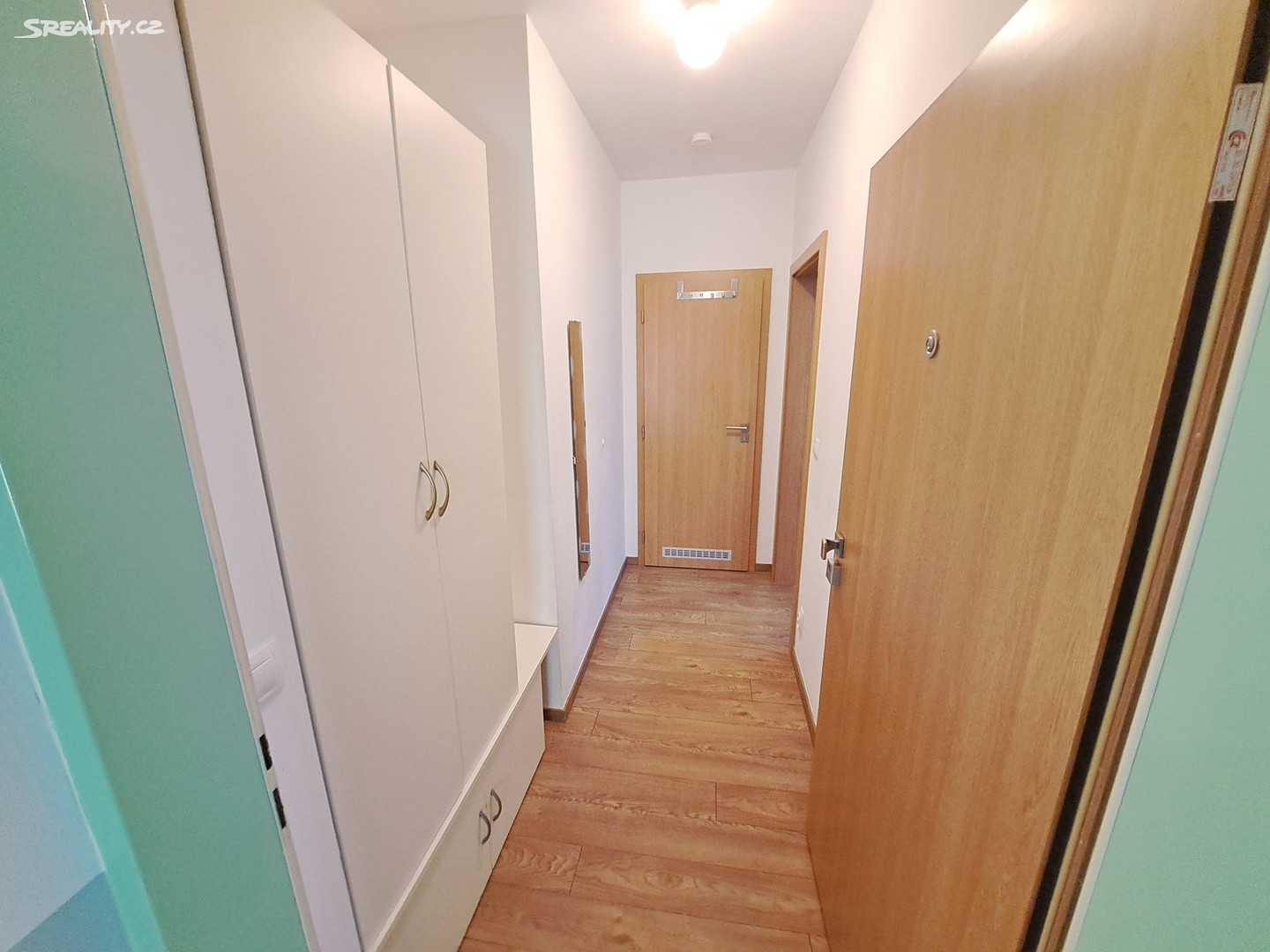 Chodba (skříň, botník, věšáky, zrcadlo, hlásič požáru).