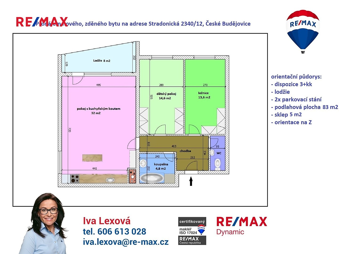 Podlahová plocha bytu je 83 m2 + lodžie 8 m2 + sklep 5 m2. Byt je dispozičně řešený jako 3+kk a sestává se z předsíně, obývacího pokoje s kuchyňským koutem se vstupem na lodžii, ložnice, dětského pokoje, koupelny s vanou a samostatného WC. Orientován je na jih a západ. Dispozici bytu s rozměry jednotlivých místností najdete na přiloženém orientačním půdorysu.