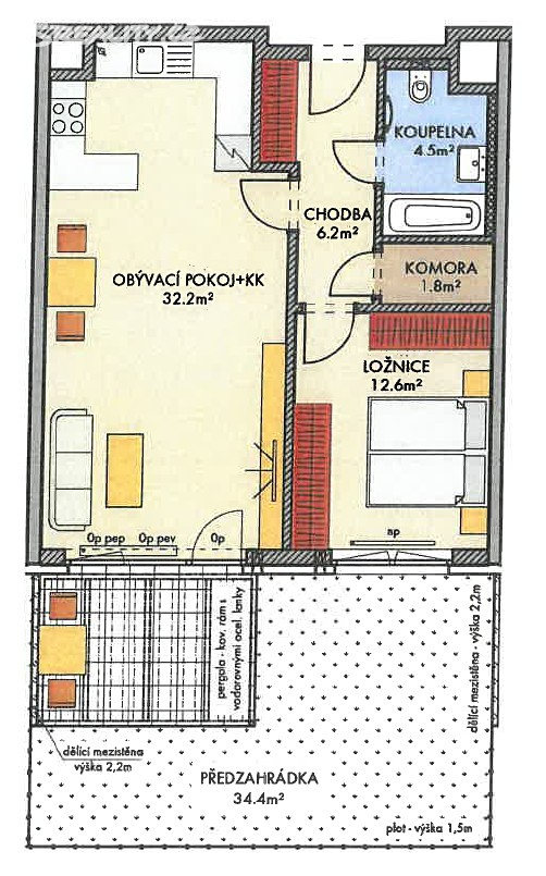 Byt bude vybaven novou kuchyňskou linkou, vybavenou spotřebiči (sklo keramika, lednice s mrazákem, el. trouba, myčka nádobí, digestoř).