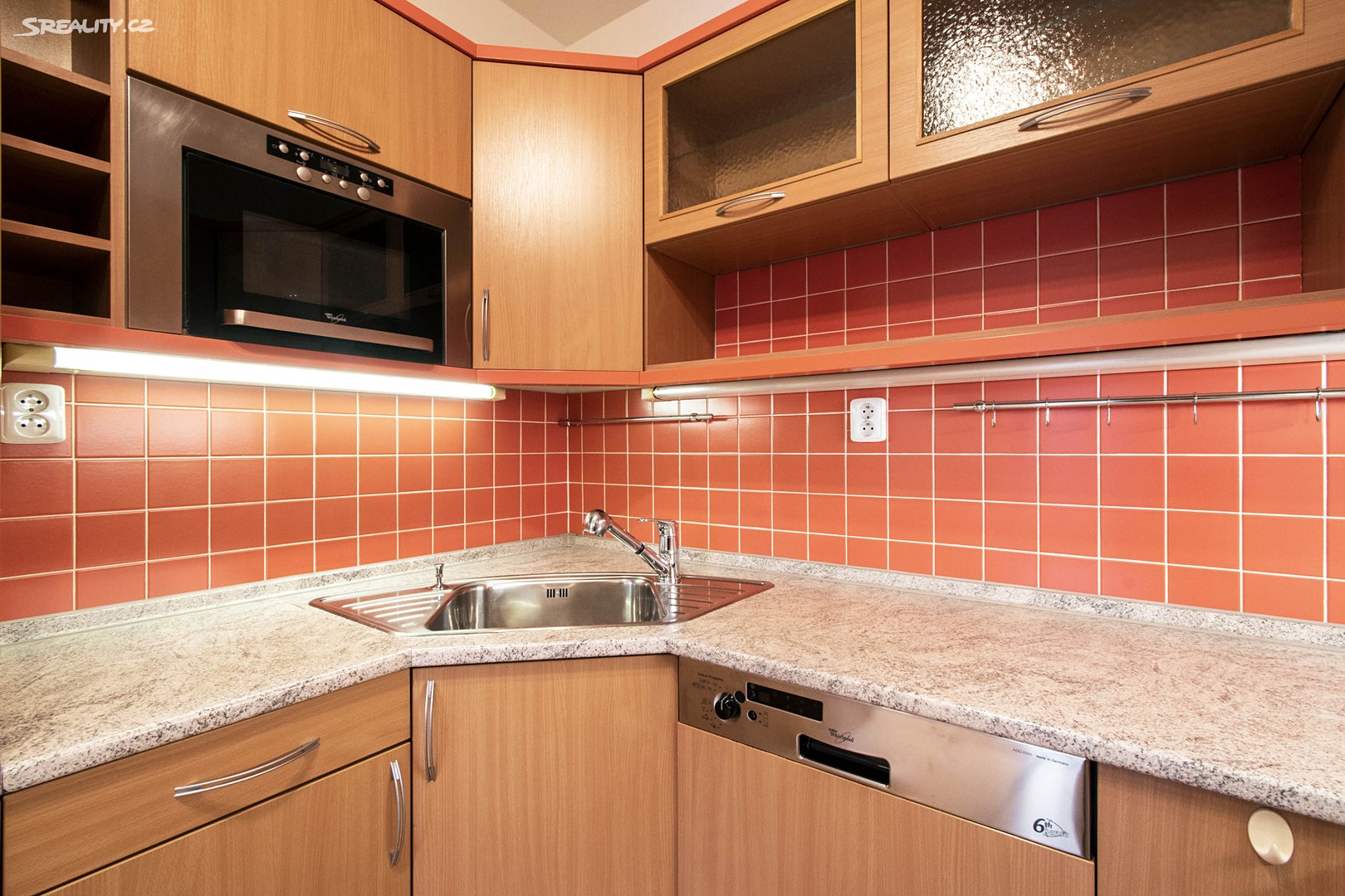 Byt se nabízí částečně vybavený. Kuchyňský kout disponuje indukční deskou, troubou, digestoří, myčkou, mikrovlnou troubou a barovým pultem se židlemi. Obývací část, která volně navazuje na kuchyň, disponuje prostorným gaučem, konferenčním stolkem a obývací stěnou. Z obývacího pokoje se dá vejít na rozlehlý zasklený balkón. Jeden z pokojů se nabízí nevybavený, ve druhém je manželská postel a velká vestavěná šatní skříň. V koupelně najdeme vanu, pračku a hned dvě umyvadla s nasvíceným zrcadlem. Toaleta je oddělená a má své vlastní umyvadlo se zrcadlem. Mnoho úložného prostoru nabízí také vestavěné skříně v chodbě.