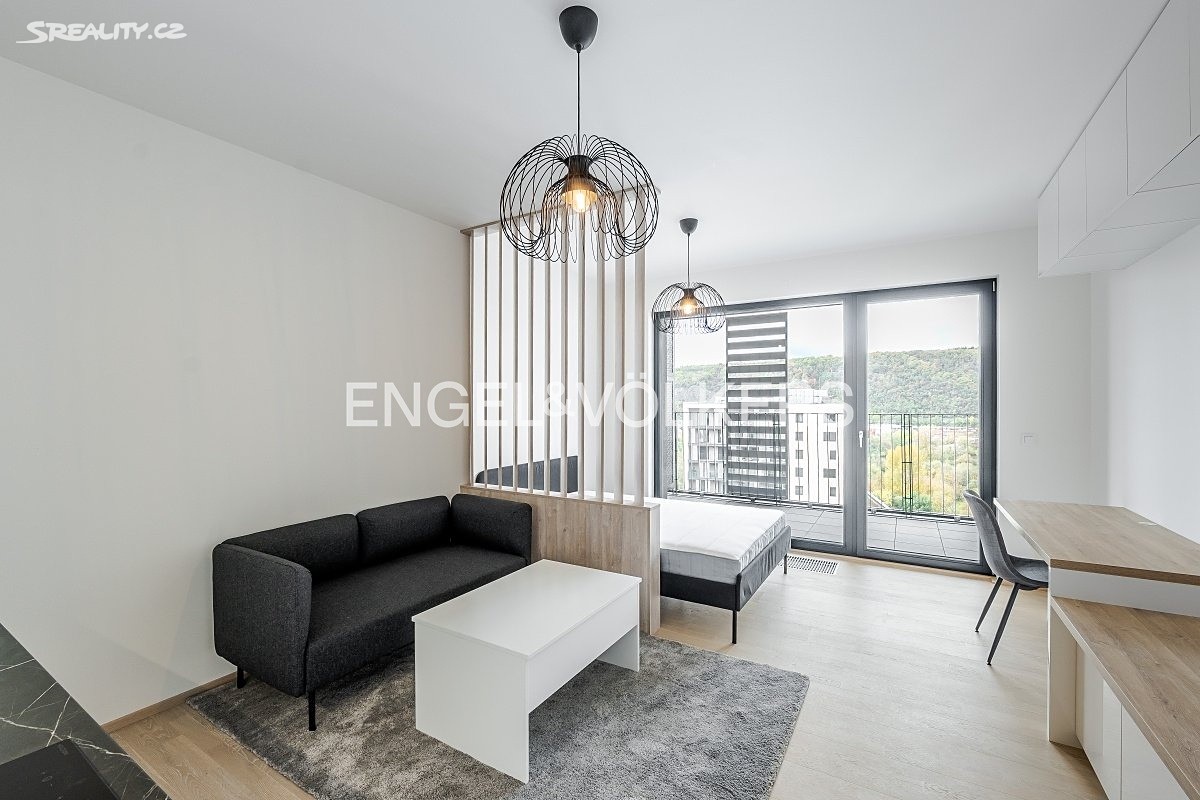 K dlouhodobému pronájmu je připraven plně zařízený byt 1+kk o rozloze 32,2 m² ve 12. nadzemním podlaží novostavby atraktivní rezidence Zahálka s výhledem na Vltavu.