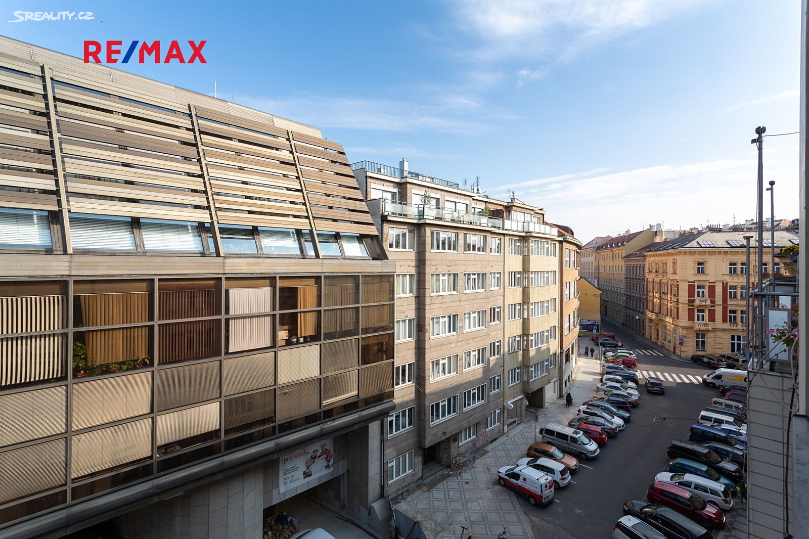 The apartment has 60 m² and is located on the 5th floor of a well-kept residential building with an elevator. The layout offers a living room with a view of Ostrovní street, a bedroom facing a quiet courtyard, a small but functional kitchen, a spacious bathroom with bathtub, a separate toilet, an entrance hall and a storage room. The kitchen is rather basic, which is the only compromise of an otherwise very comfortable and representative apartment.