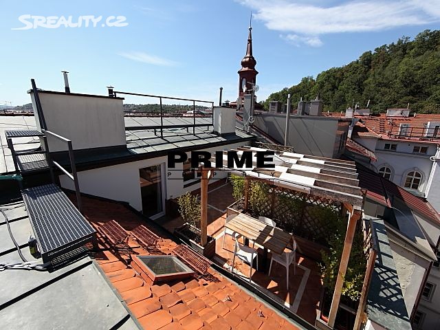 The lower level comprises: a living room with exposed beams, a fully fitted kitchen (with electric cooking hobs, oven, refrigerator and a dishwasher), a master bedroom with a balcony, a walk in closet and a bathroom (bathtub, shower cubicle, 2 sinks, toilet and a bidet), 2 more bedrooms with access to a balcony, a bathroom (bathtub, sink, toilet and a bidet) and 2 small storage rooms. The upper level: a spacious, open plan room with exposed beams (can be used as a guest bedroom, family room or as a playroom for children), a bathroom (shower cubicle, toilet, bidet and sink), a laundry room (washing machine and dryer) and a 35m2 terrace with a pergola and terrace furniture and with views of Petřín Hill Park and Prague Castle.