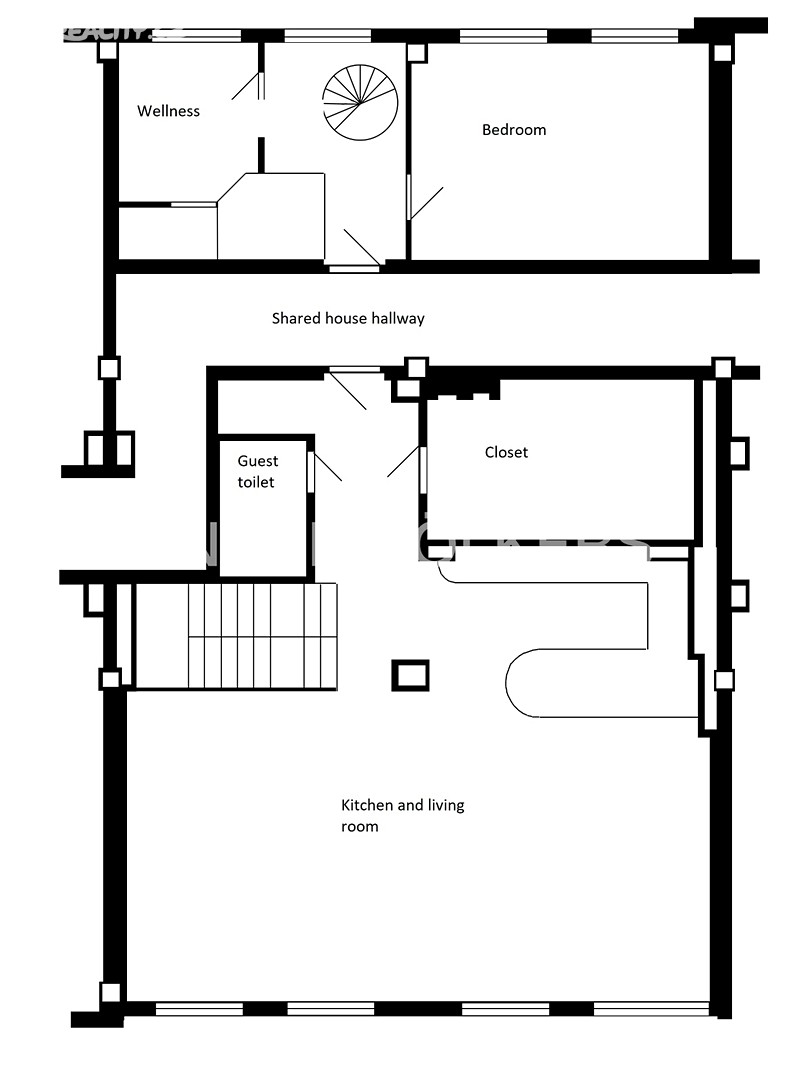 On the upper floor there is one bedroom, an open office (gallery), a bathroom and an open dressing room with built-in wardrobes.