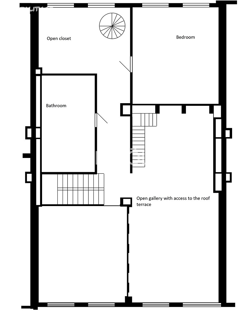 The roof terrace is accessible from the gallery via a spiral stairs.