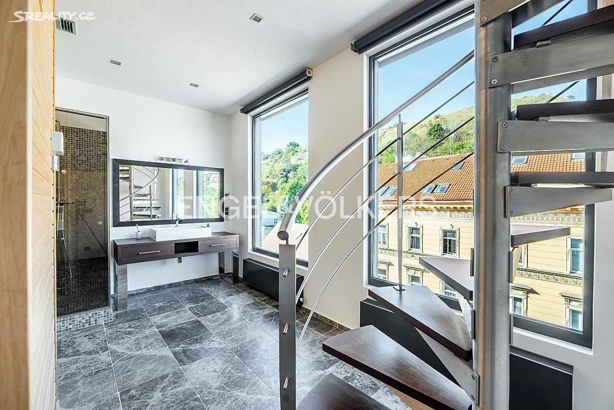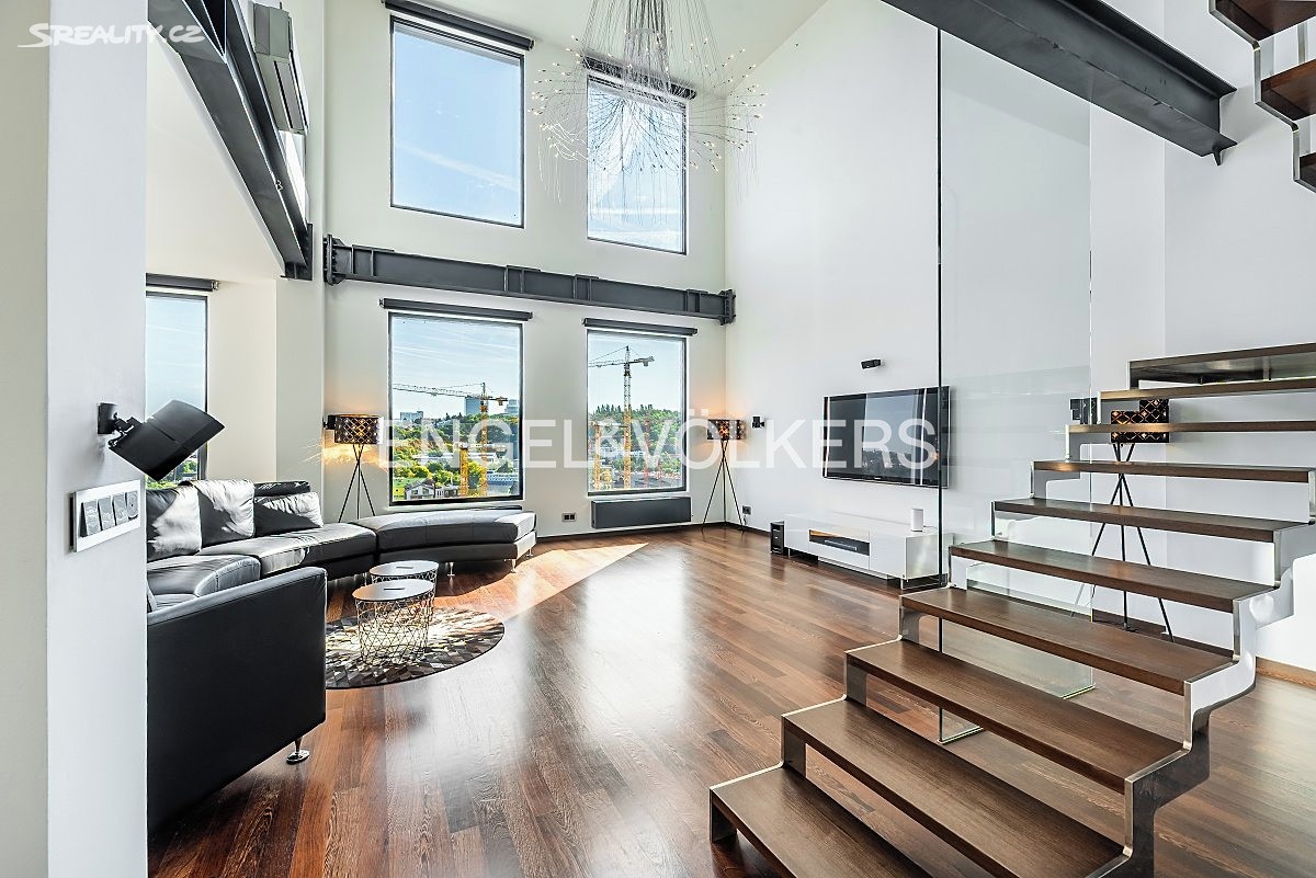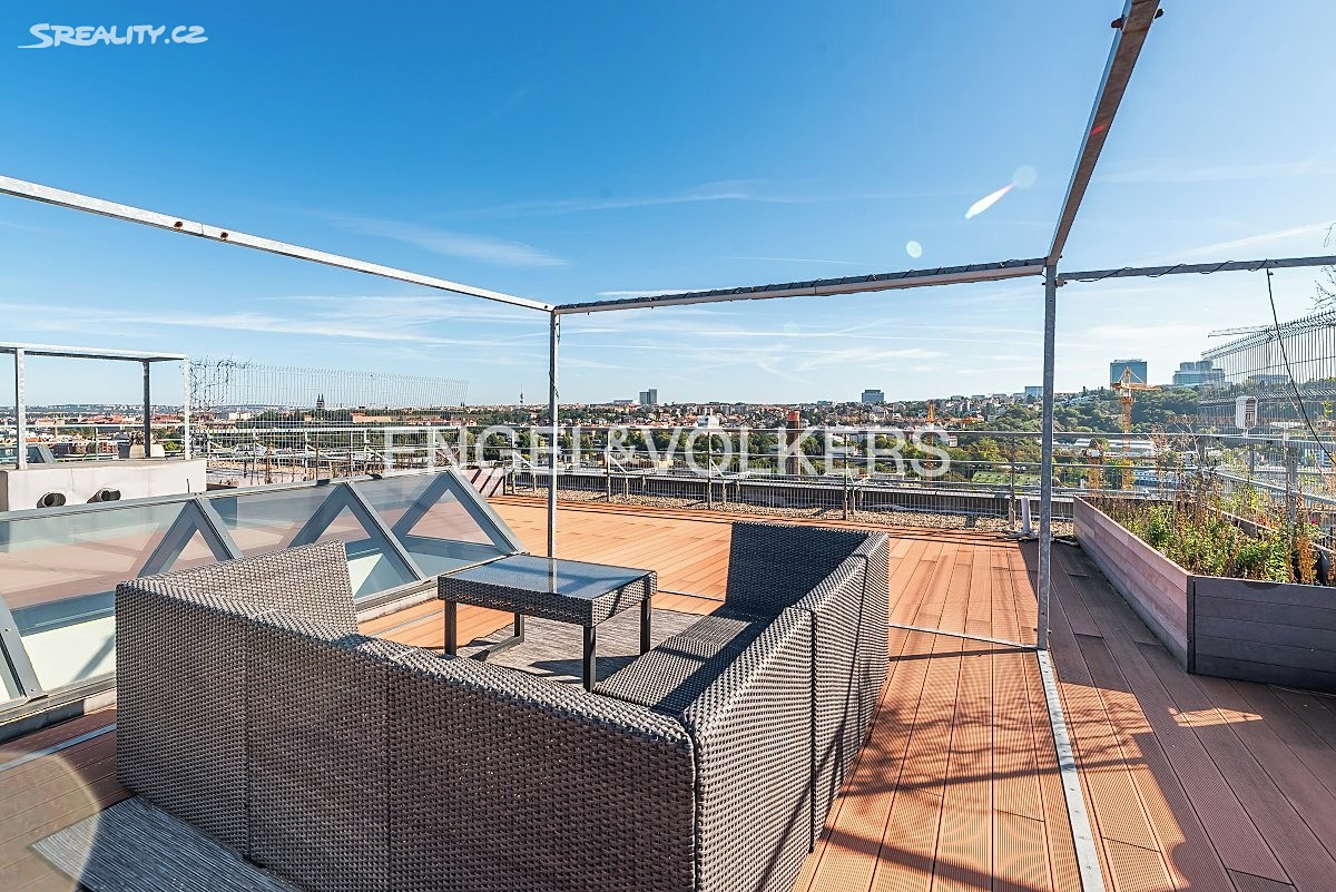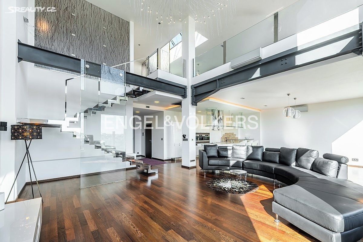 Luxury loft duplex on the 5th - 6th floor with a roof terrace and panoramic views of the Vltava valley, Vyšehrad, Dívčí Hrady and Prague Castle. The loft is located in an industrial building and is situated close to the commercial centre Anděl, near the quiet surroundings of the Prokopské údolí valley.