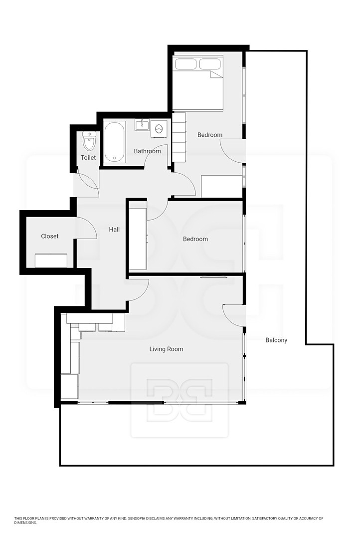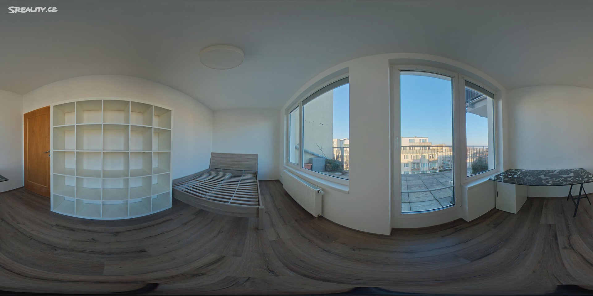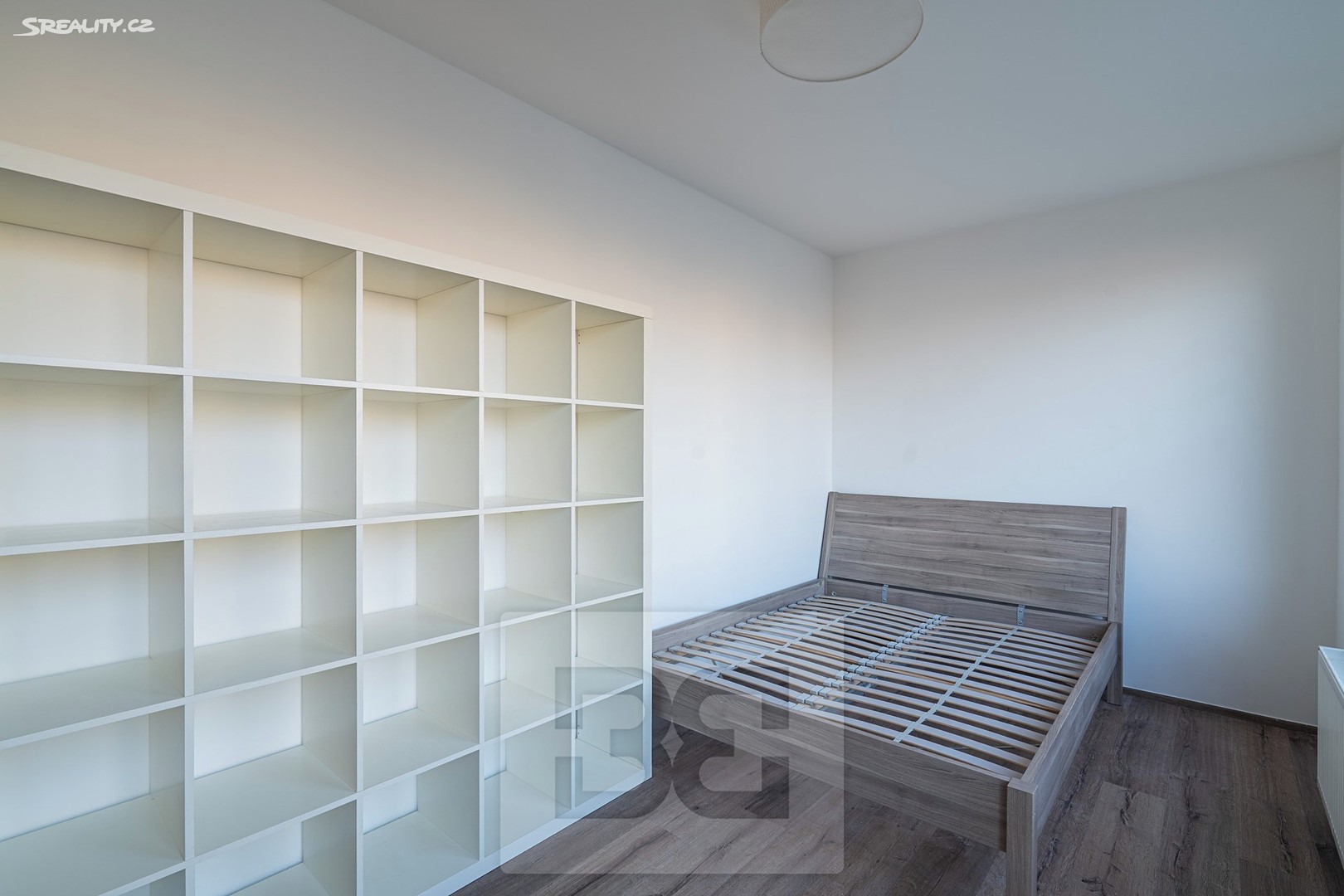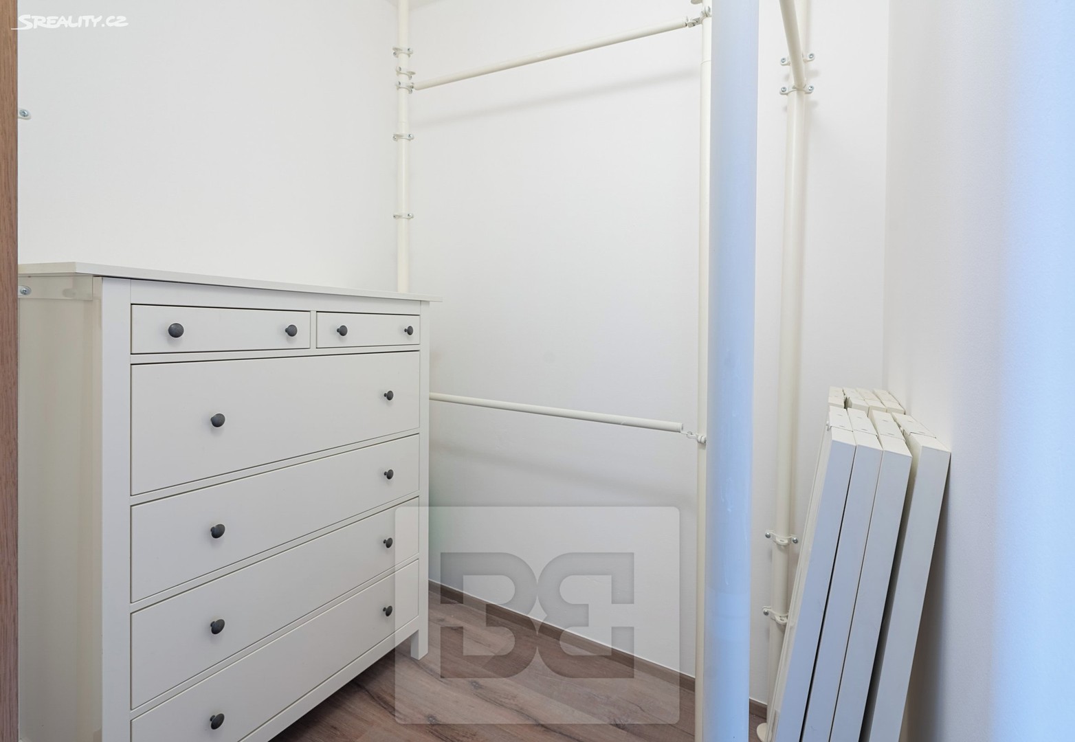 The main bedroom is partially furnished with a bed, a desk, and a bookcase. The second, smaller bedroom is fitted with a wardrobe. Another major benefit is a separate walk-in wardrobe located directly in the apartment.