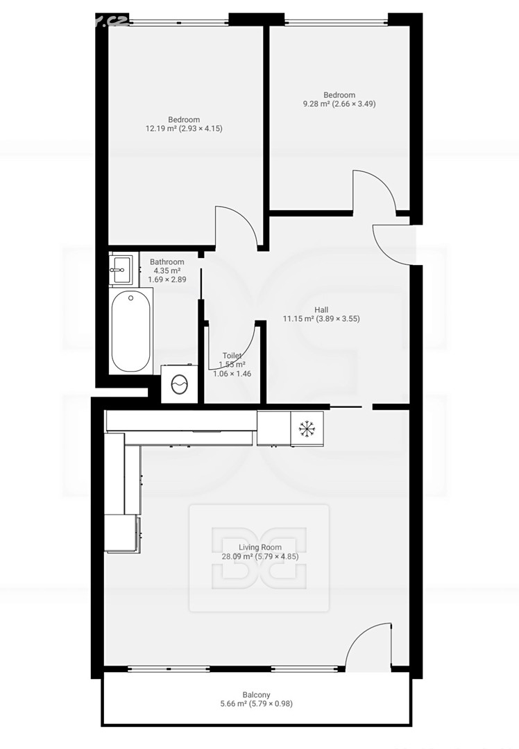 The apartment features a spacious living room with a modern kitchenette and access to a balcony. The kitchen includes a refrigerator, dishwasher, convection oven, microwave, induction cooktop, and plenty of counter and storage space. The apartment offers 2 separate bedrooms. The bathroom is equipped with a bathtub and a washing machine. The toilet is separate. There is a storage area on the floor opposite the apartment. Additionally, a stroller storage room on the ground floor of the building is available for use.