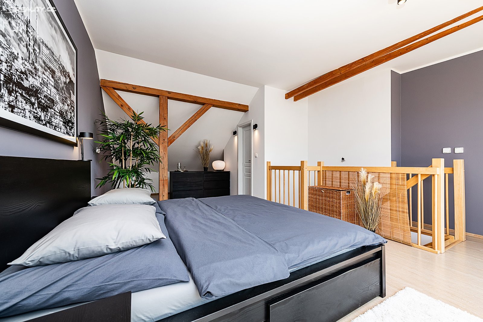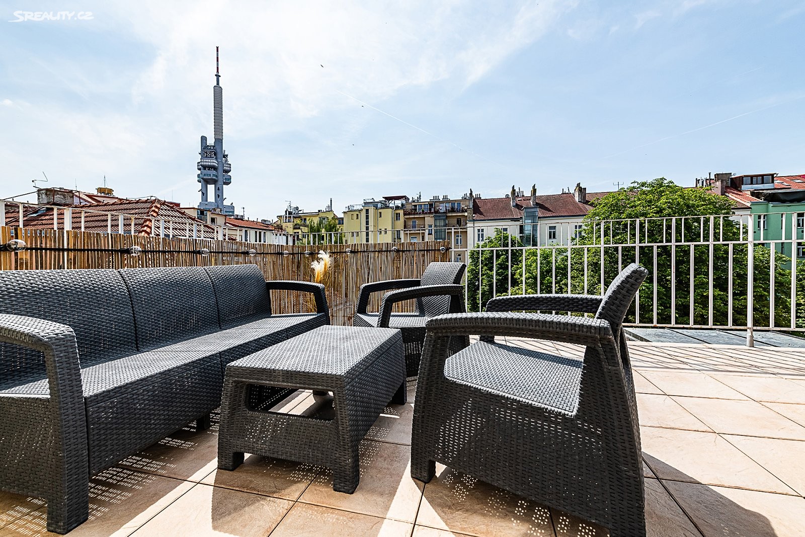 We offer for rent a spacious, sunny one bedroom duplex apartment of 100 sqm with a south-facing terrace (16 sqm) on the 5th and 6th floors of an apartment building with an elevator in the sought-after location of Prague 3 - Žižkov. The fully furnished apartment offers an entrance hall on the lower floor, a living room with windows facing to a quiet courtyard, a fully equipped kitchen with a dining area, a bathroom with a corner bathtub and shower, toilet, washing machine and dryer, and a utility/storage room. The upper floor is dominated by a bedroom (facing the courtyard) with access to a large private terrace with a pleasant view of the courtyard and the Žižkov Tower. There is also a small bathroom with a shower and toilet. The apartment is equipped with modern furniture, air conditioning and a gas boiler, internet, and the floors are wooden parquet and tiles. The house is located on the border of Žižkov and Vinohrady, in a popular location with all amenities, restaurants, cafes, bistros, shops, with excellent access to the city center on foot (approx. 15 minutes) or by public transport, the tram and metro station are just a few minutes walk away. Nearby is the Riegrovy sady park, Jiřího z Poděbrad Square, where farmers' markets are held, or Náměstí Míru Square.