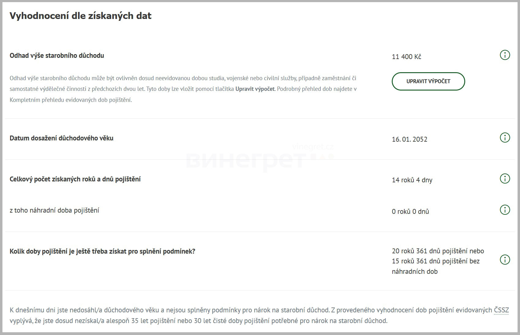 В 2021 году Чешское управление социального обеспечения (ČSSZ) запустило на своем сайте персональный онлайн-калькулятор пенсии по старости. С его помощью каждый авторизованный пользователь может узнать дату выхода на заслуженный отдых и приблизительный размер ежемесячных выплат на текущий момент.