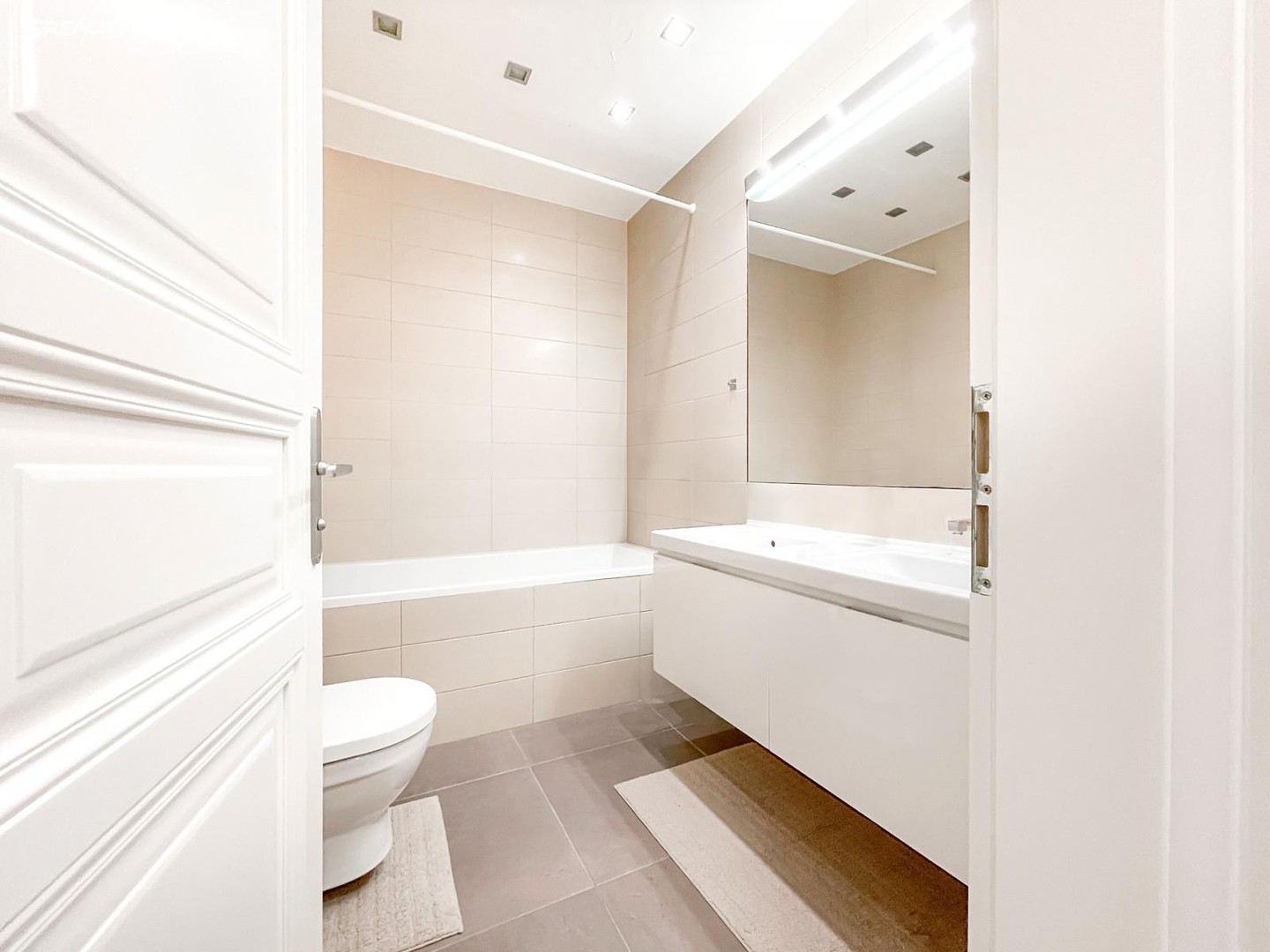 На нижнем уровне расположены две отдельные спальни (17,27 м² и 15,65 м²), просторный коридор с лестницей (19,87 м²), ванная комната с ванной (4,95 м²) и отдельный туалет (2,86 м²). В квартире — качественные деревянные полы, в санузлах — плитка. Комфорт обеспечивает кондиционер и входная дверь с повышенным уровнем безопасности.