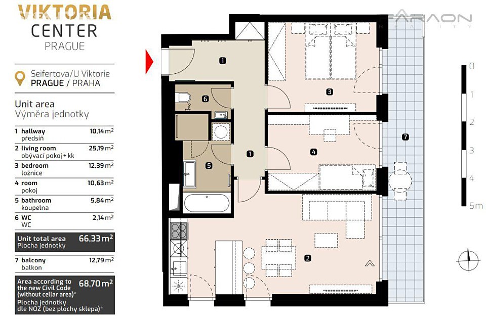 Предлагаем в аренду современную квартиру 3+kk, площадью 69 м² с большим балконом 13 м² и подвалом, расположенную на 2-м этаже новостройки, в проекте «Виктория Центр» в районе Жижков. Вместе с квартирой можно арендовать гаражное место.