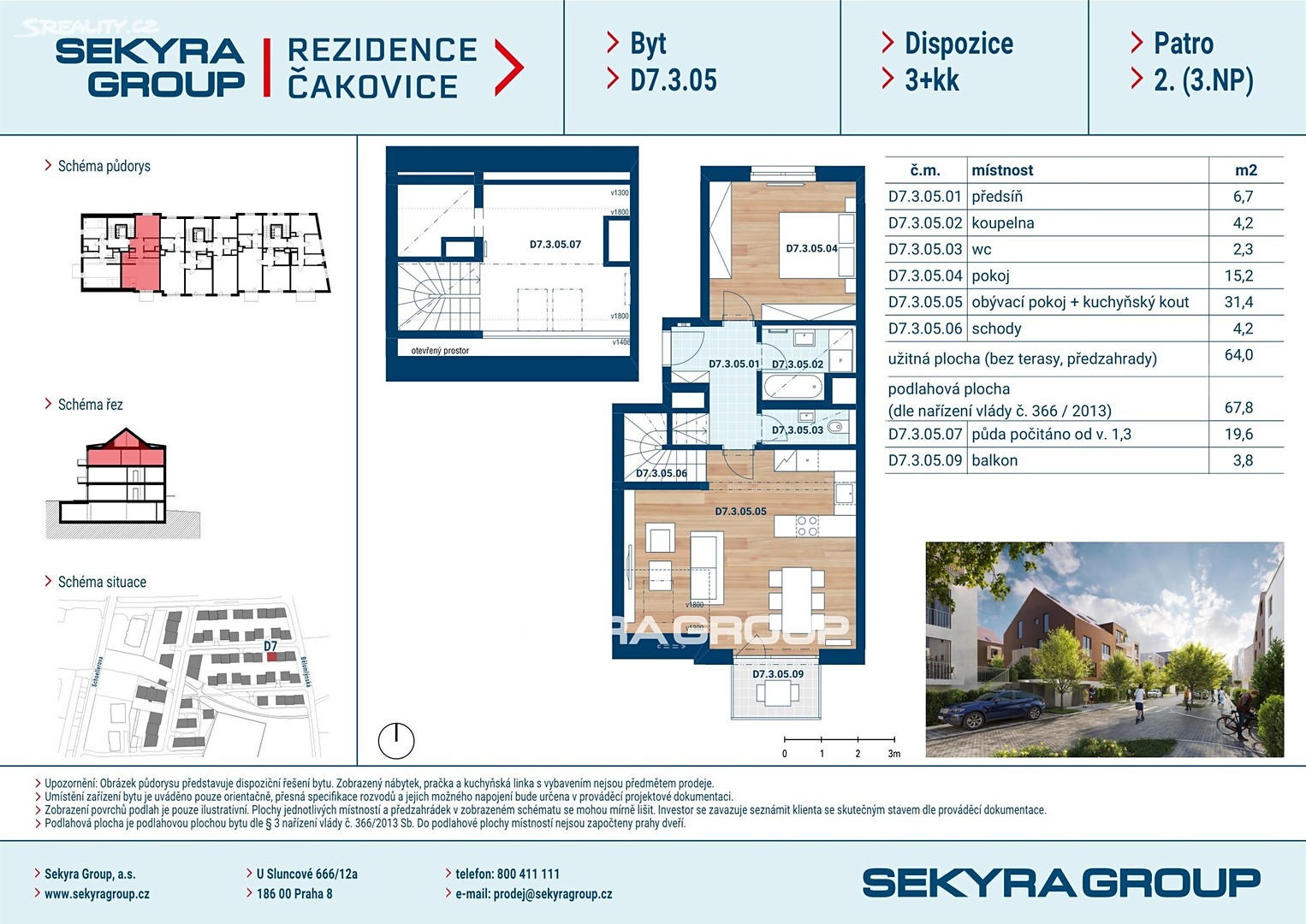 Dovolujeme si Vám nabídnout k prodeji byt 3+kk o výměře 67,8 m² s půdním prostorem 19,6 m² a balkónem 3,8 m² v rezidenčním projektu Rezidence Čakovice.