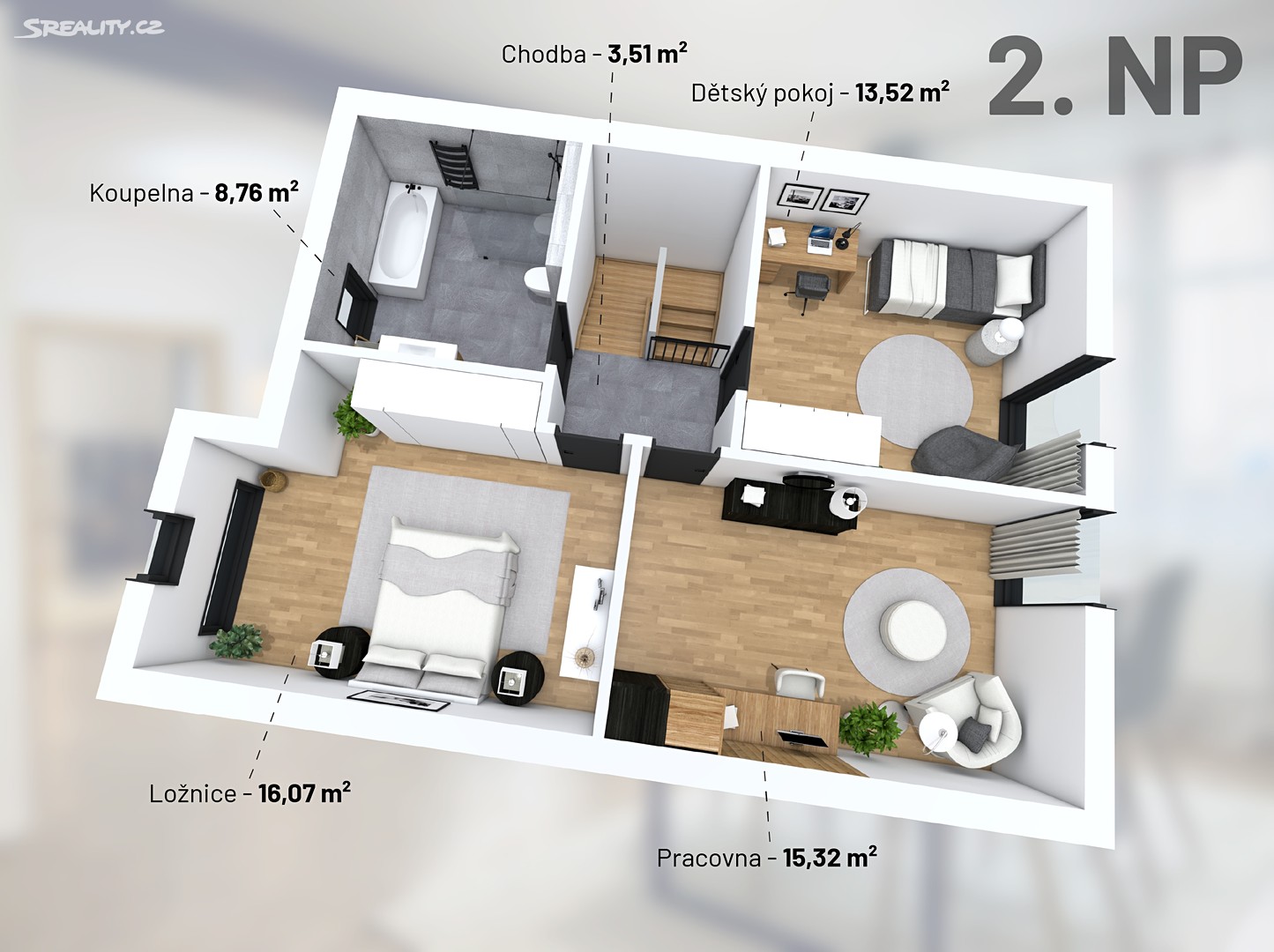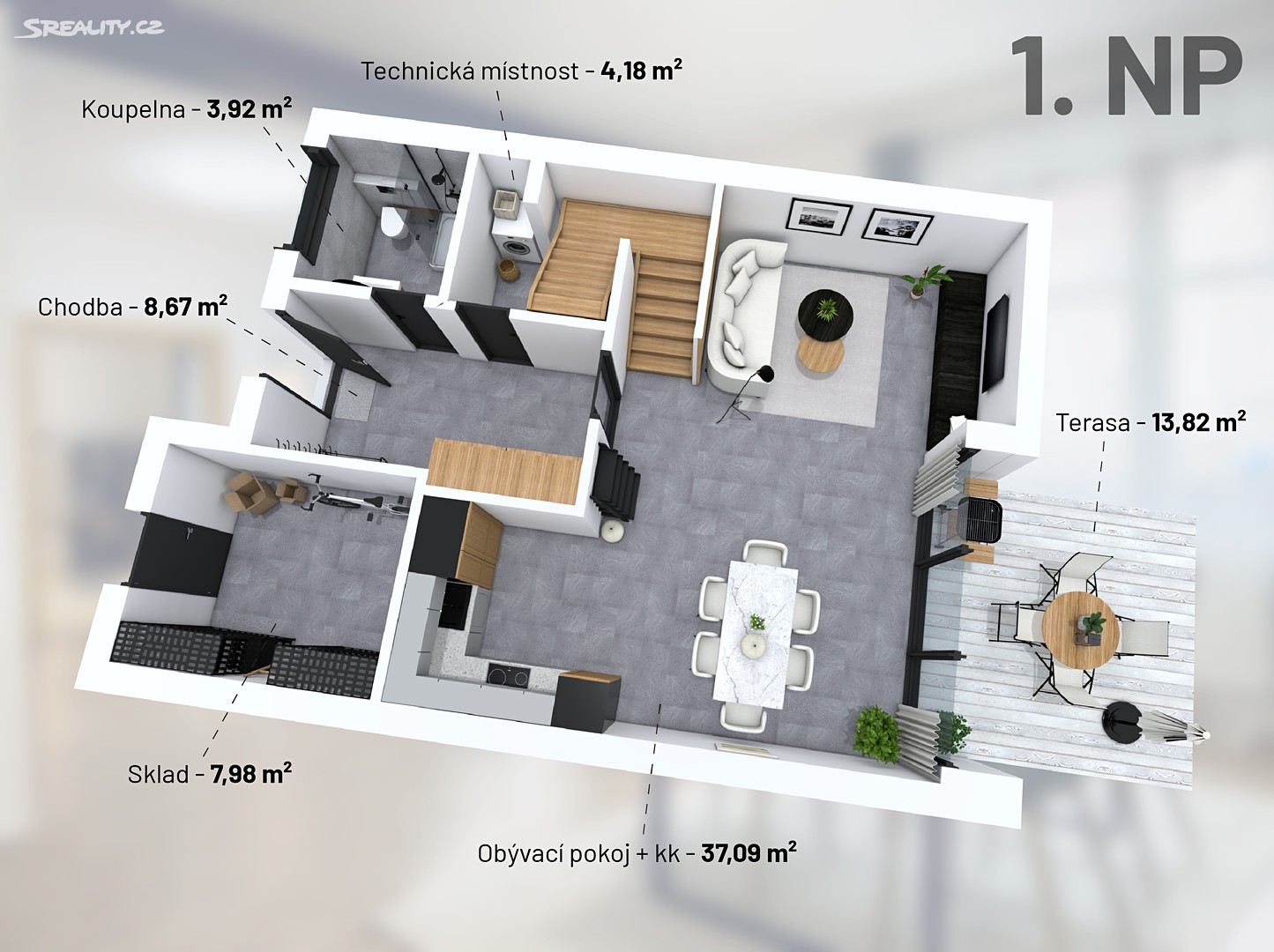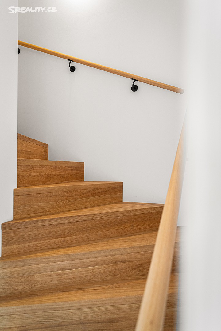Z obývacího pokoje vede přímý vstup na terasu ze sibiřského modřínu. Do horního patra vede schodiště z ocelové konstrukce s dubovými nášlapy. Součástí bytu je prostorný sklad o výměře 8m2 pro kola a lyže, dvě vyhrazená parkovací místa z betonových dlaždic a přístupová cesta tvořená nášlapy.