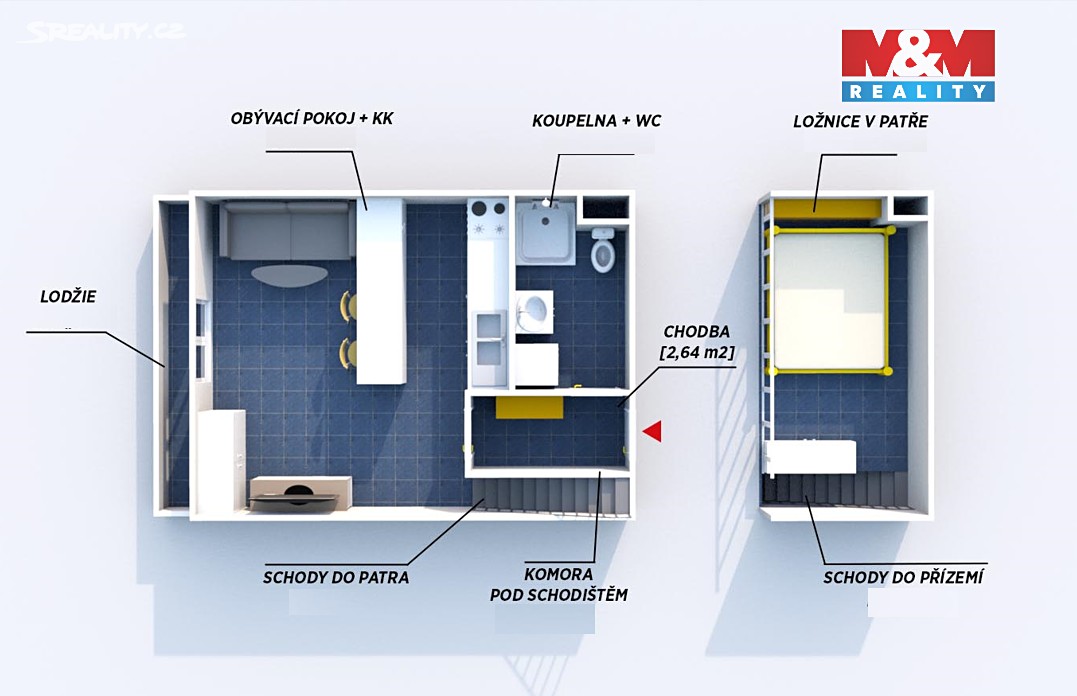 Rozdělení na denní a noční zónu dává bytu vzdušnost a pocit mnohem většího prostoru než u běžných garsonek.<br />