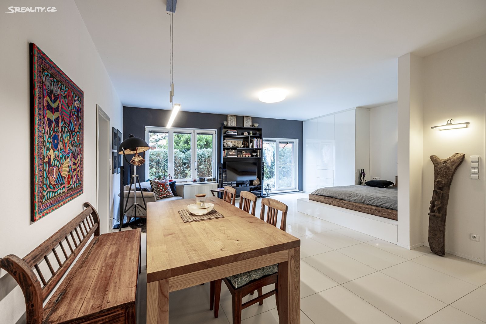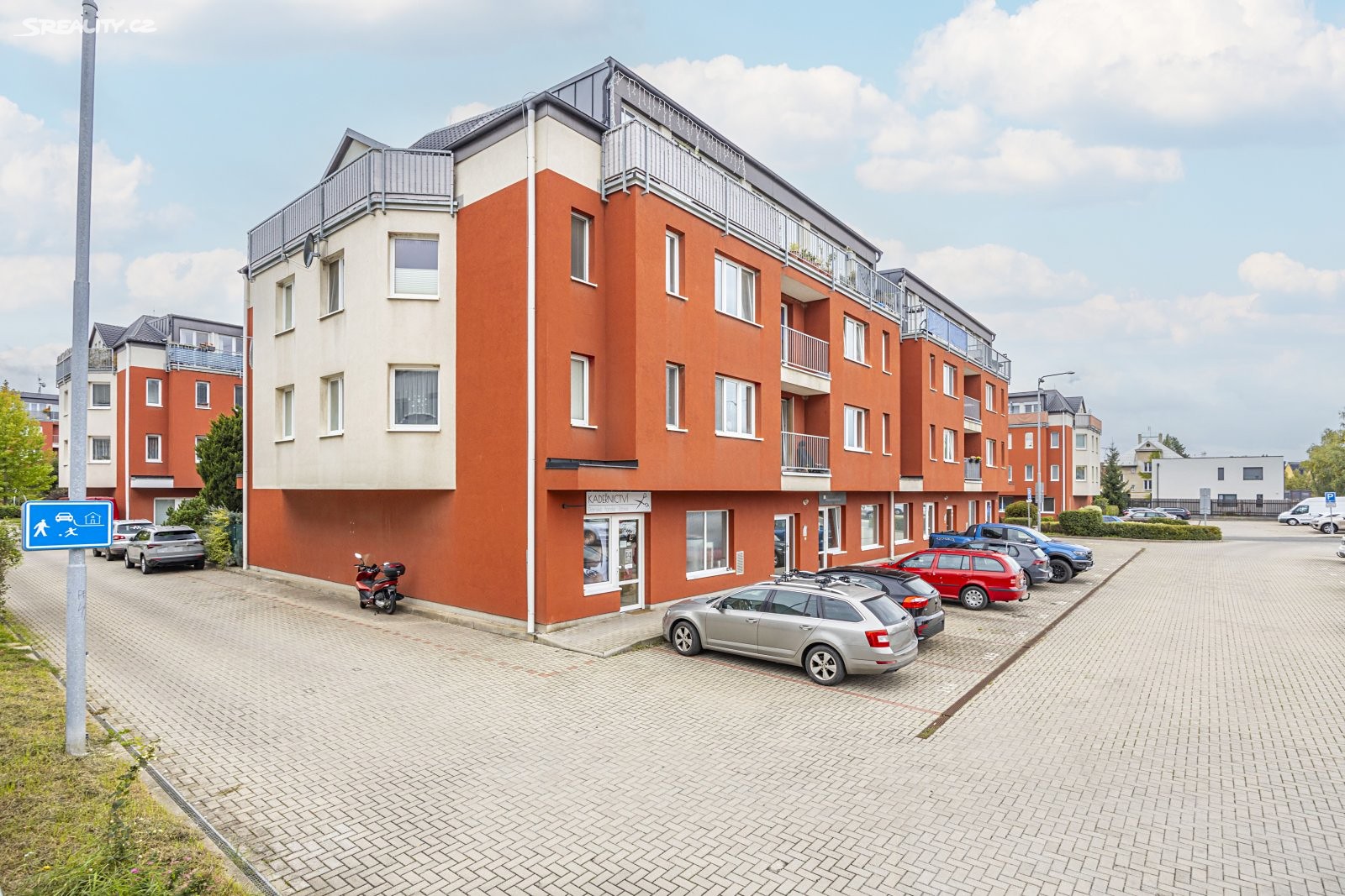 Nabízíme k prodeji byt (3+kk), současná dispozice 2+kk o výměře 69,3 m2 v 1.NP s předzahrádkou o rozloze 39 m2 a vlastním parkovacím stání před domem 13 m2. Vstup do bytu tvoří chodba (předsíň), velký obývací pokoj s kuchyňským koutem a vestavěnými spotřebiči, v obývacím pokoji je možné umístit velkou manželkou postel viz. fotografie. Dále se zde nachází jídelní stůl a pohovka, ložnice, (která může sloužit jako dětský pokoj) a koupelna se sprchovým koutem. V celém bytě je na podlaze dlažba (italský mramor). Díky vestavěným skříním je v bytě dostatek úložného prostoru. Z obou pokojů je vstup na předzahrádku.