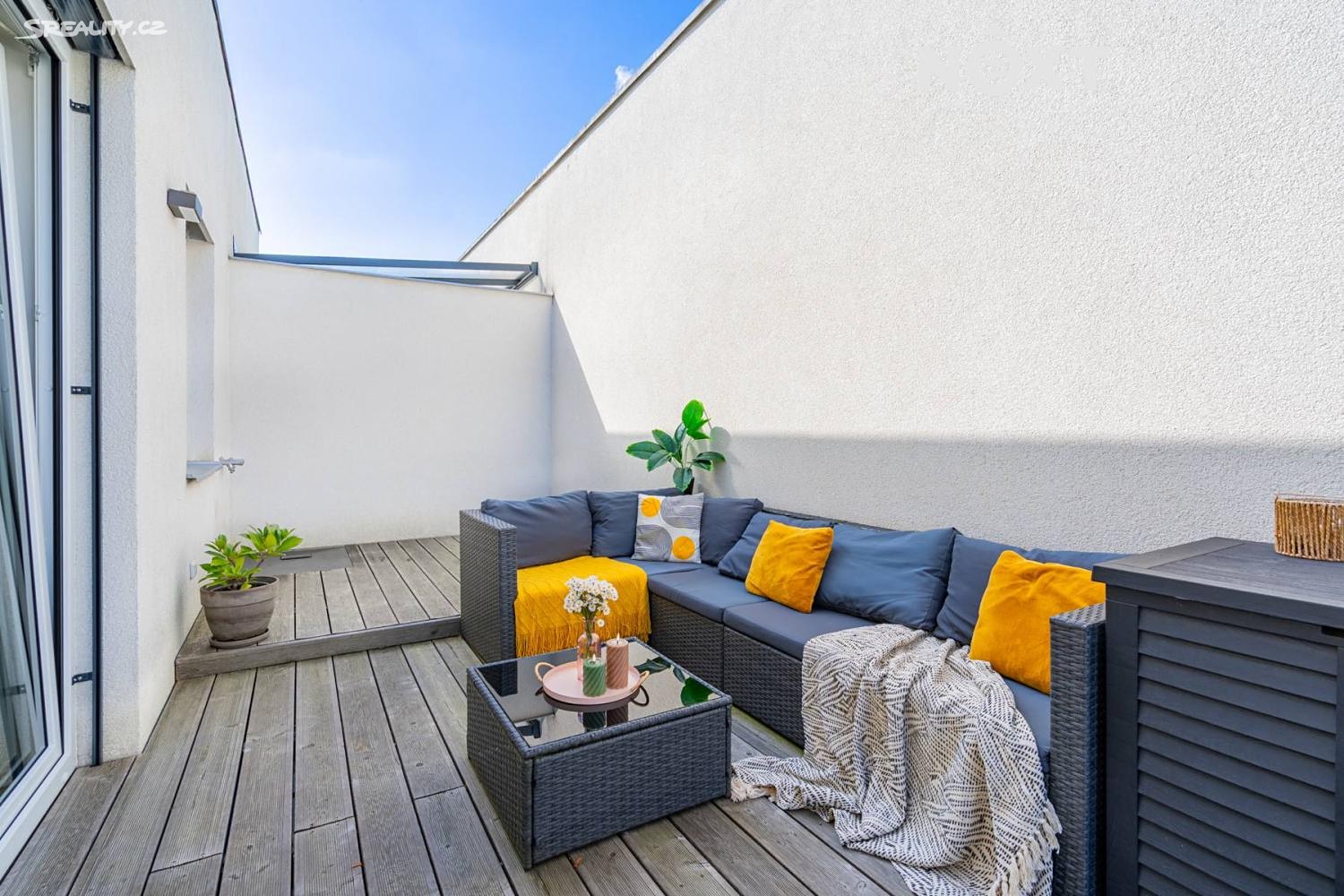 Z obývacího pokoje i ložnice je přímý vstup na terasu, která bytu dodává jedinečný charakter. Okna jsou navíc vybavena předokenními žaluziemi, které zajišťují soukromí i tepelný komfort.