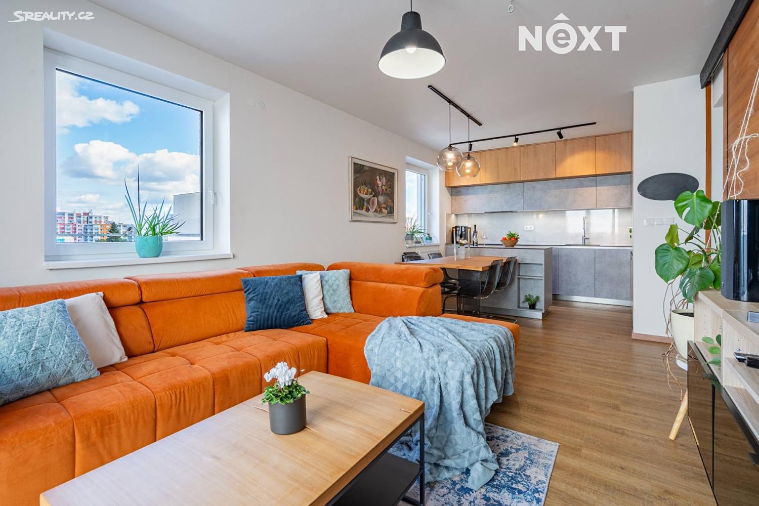 - obývací pokoj s kuchyňskou linkou (26,2 m²) vybavenou spotřebiči značky BOSCH
