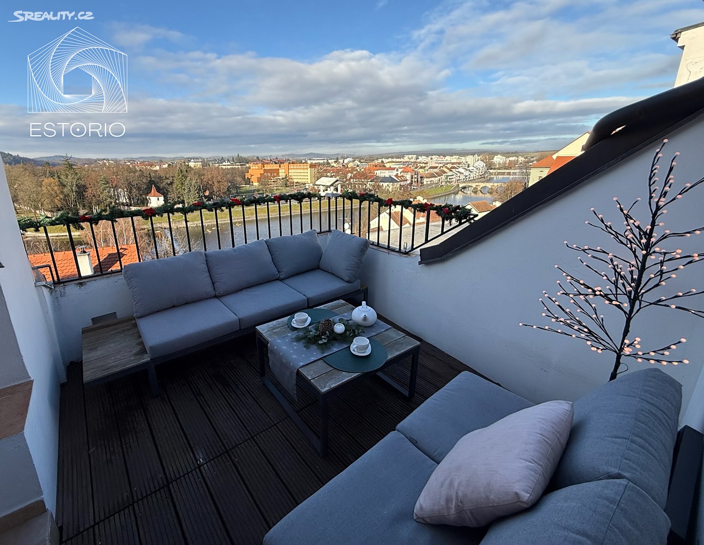 K bytu náleží západně orientovaná 8m² terasa, umístěná uvnitř střechy objektu. Nabízí výhled na řeku Otavu, Kamenný most, jez a okolní domy historického jádra. Terasa je vybavena venkovní sprchou.