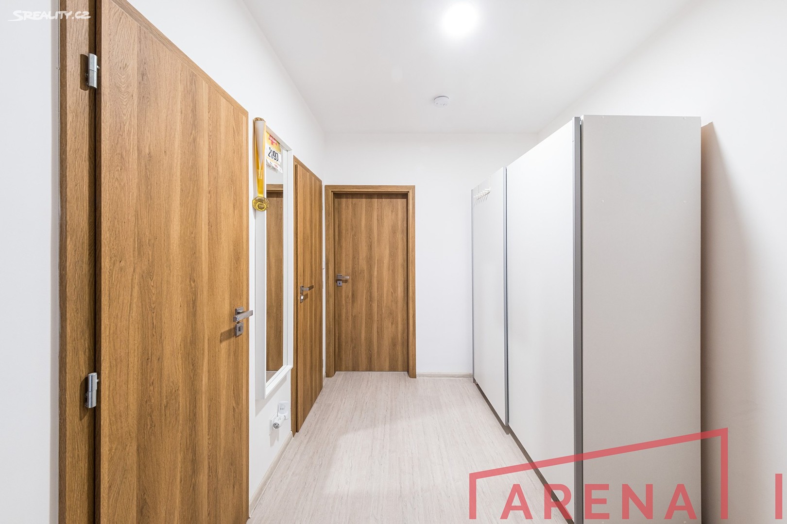 Dominantou bytu je elegantní obývací část s kuchyňským koutem, navržená v moderním a nadčasovém stylu. Kuchyňská linka na míru je osazena kvalitními spotřebiči a doplněna praktickým ostrůvkem, který podtrhuje celkový estetický dojem. Celý prostor je prosvětlený a vzdušný, navržený pro pohodlný každodenní život.
