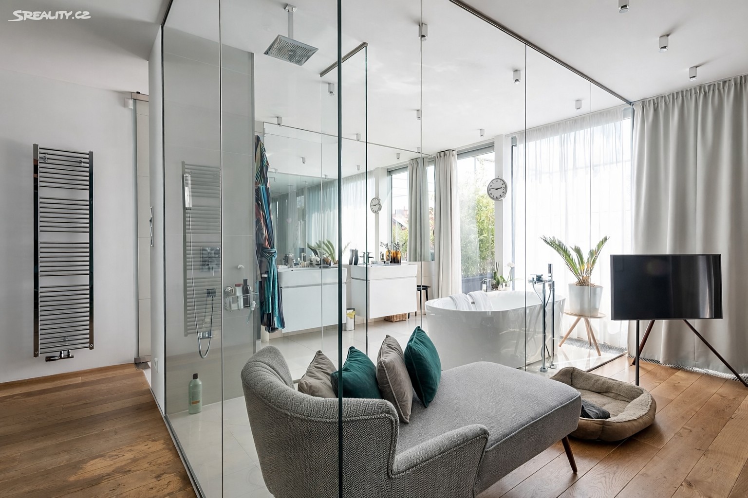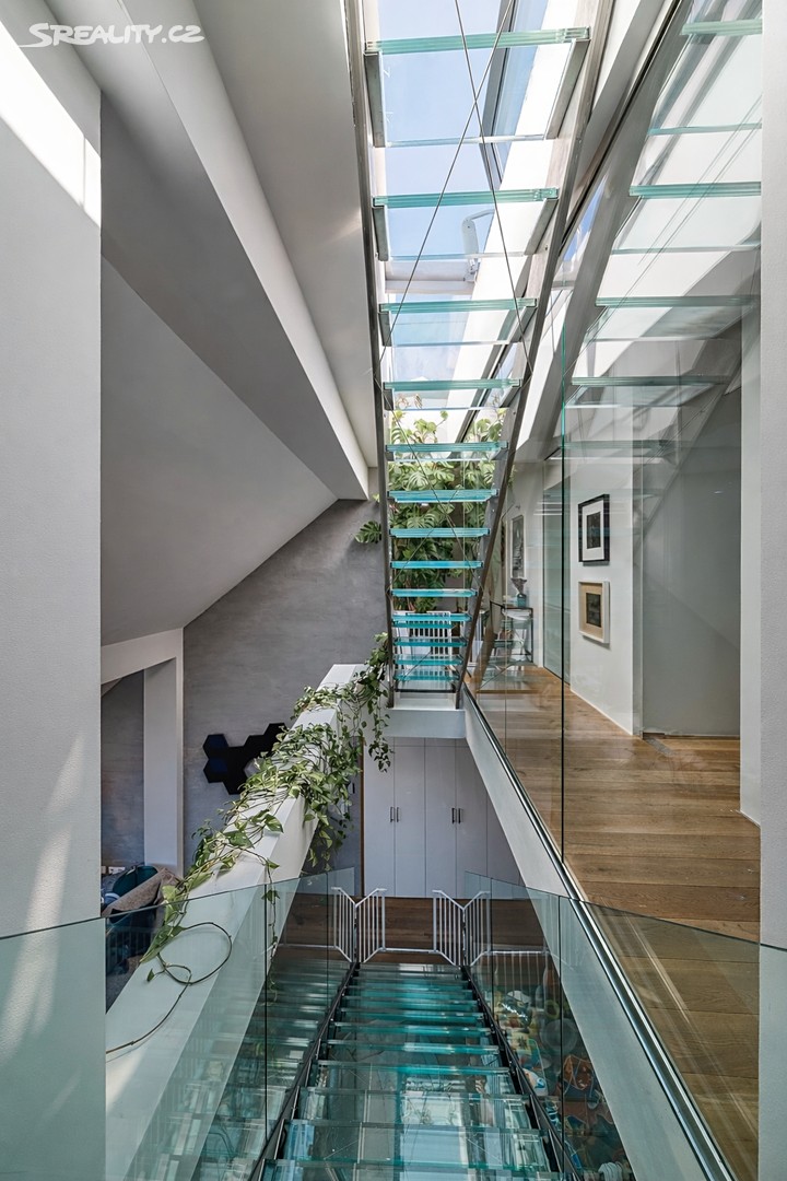 Horní patro disponuje třemi ložnicemi, dvěma koupelnami s vanou, samostatnou toaletou a prostornou šatnou. Také z této úrovně je zajištěn vstup na střešní terasu, která poskytuje dostatek soukromí i prostoru pro relaxaci, odpočinek nebo společenská setkání.