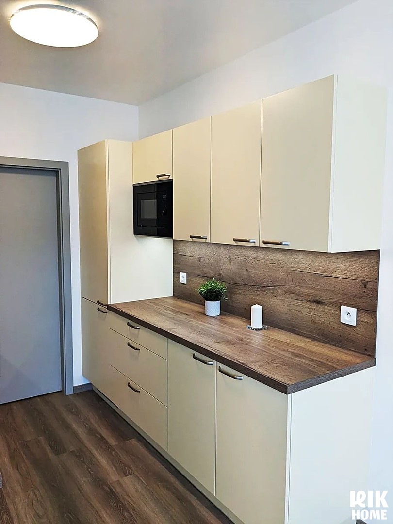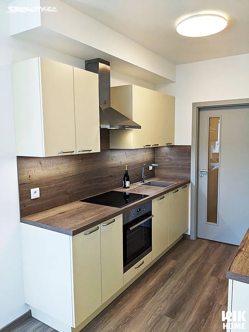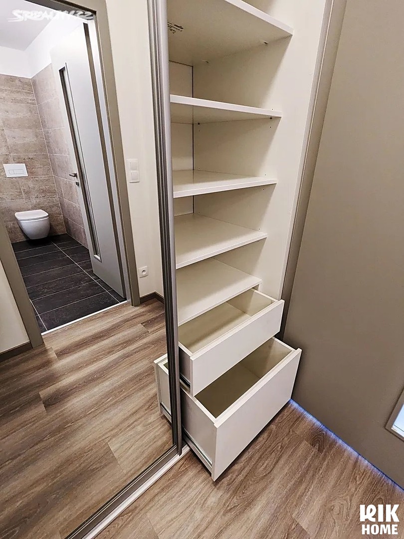 Kuchyňský kout je vybaven kuchyňskou linkou se spotřebiči, které umožňují komfortní každodenní fungování. V bytě nechybí ani úložné prostory, které přispívají k jeho praktičnosti.