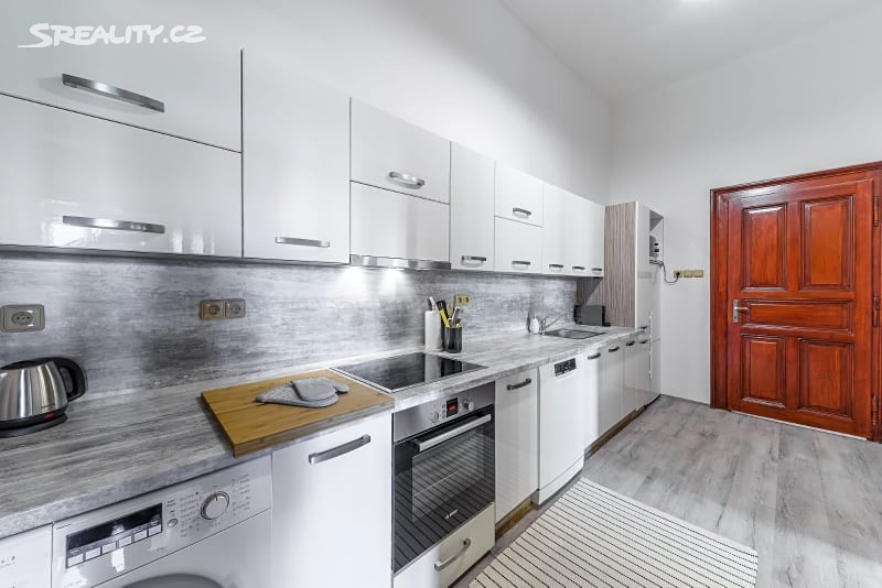 Disponuje značkovými spotřebiči - elektrický sporák, myčka, pračka Bosch, lednice s mrazákem Electrolux.