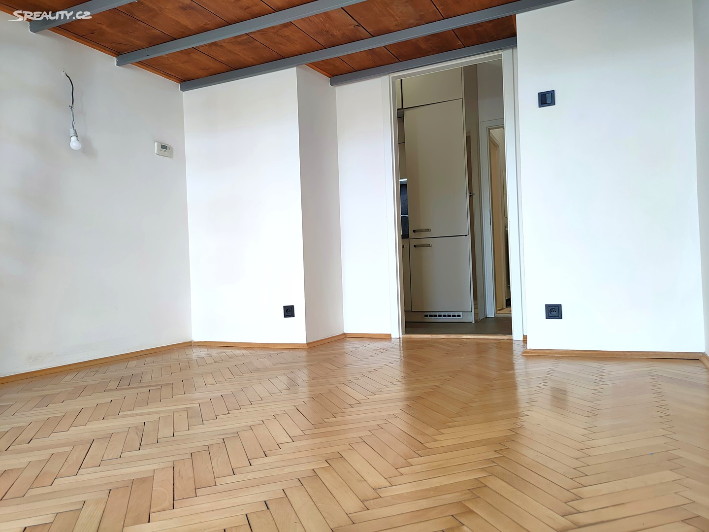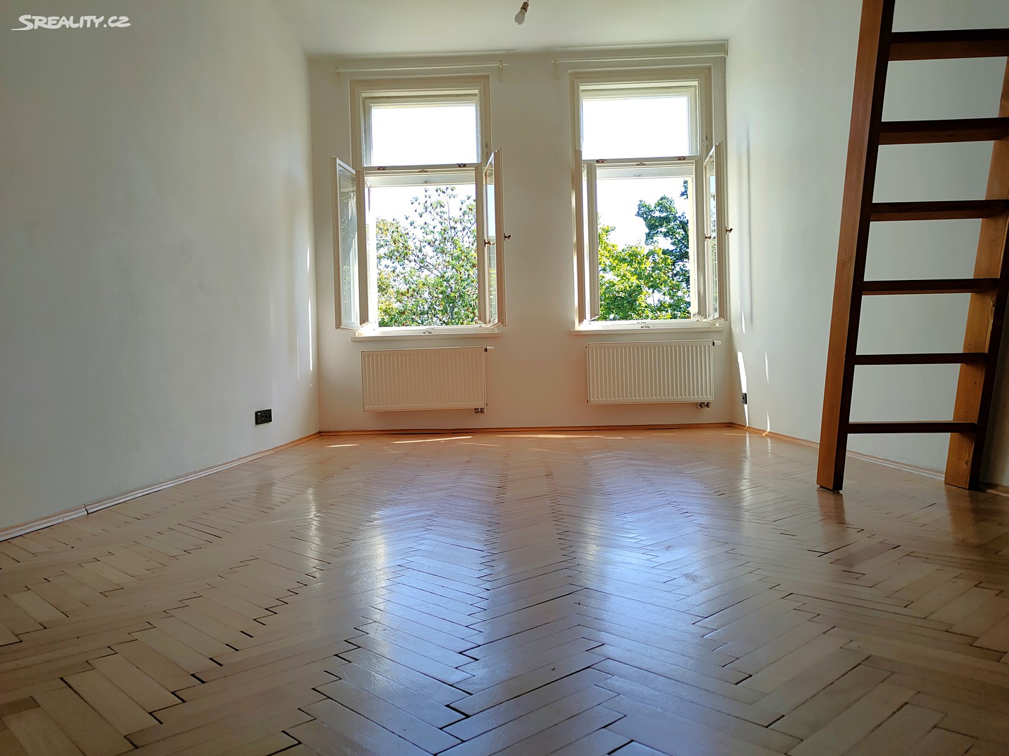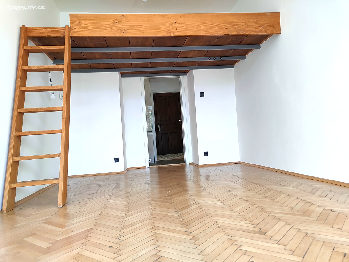 Dále se vstupuje do pokoje, orientací do zeleně parku, kde je umístěno vestavné patro na spaní, podlahová krytina jsou zde parkety.