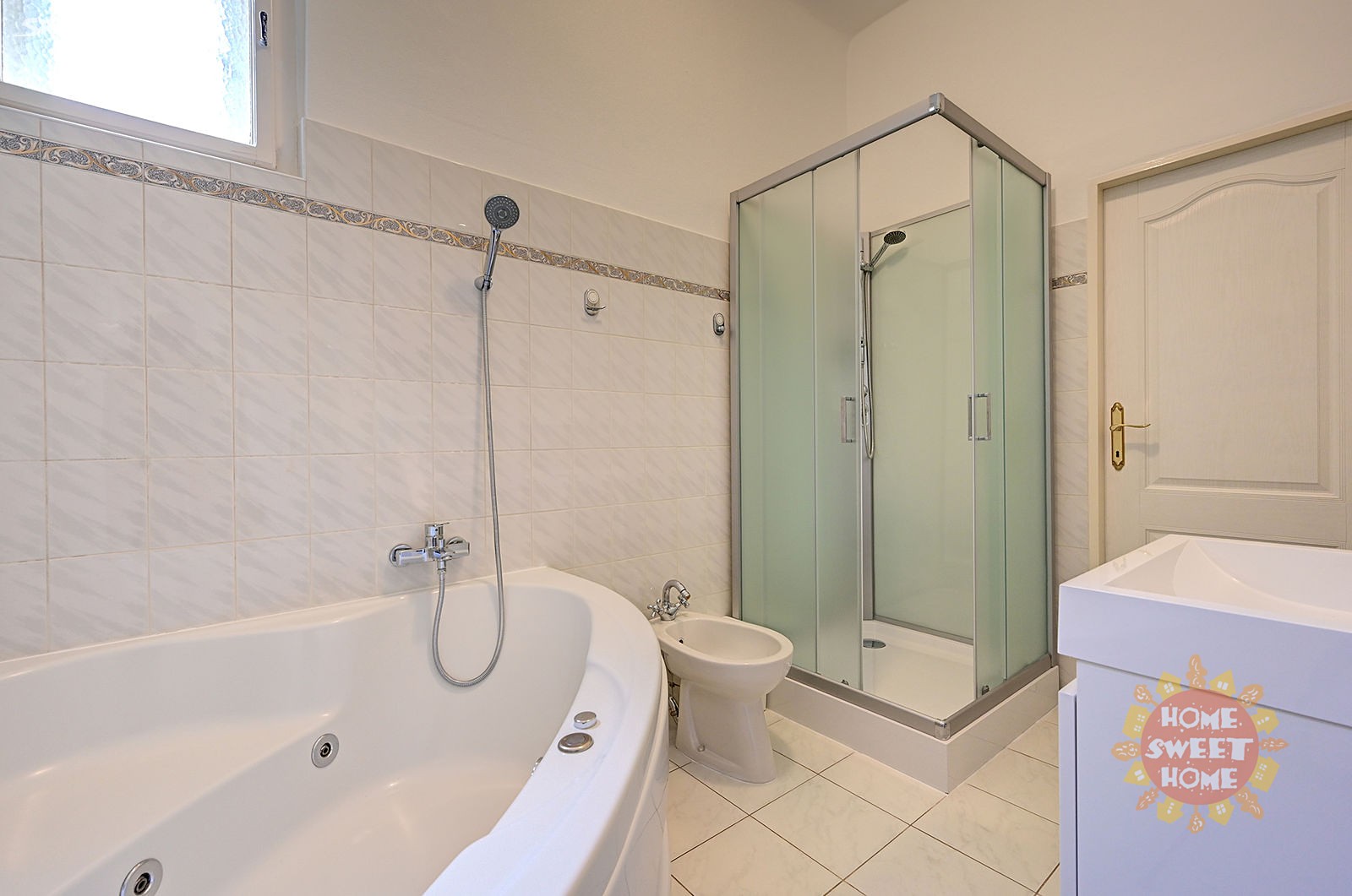 an entrance hall, a modern furnished living room, a study, two separate bedrooms, a separate kitchen with a dining area and equipped with all appliances, a bathroom with a corner bathtub, shower corner and a toilet, another separate toilet.