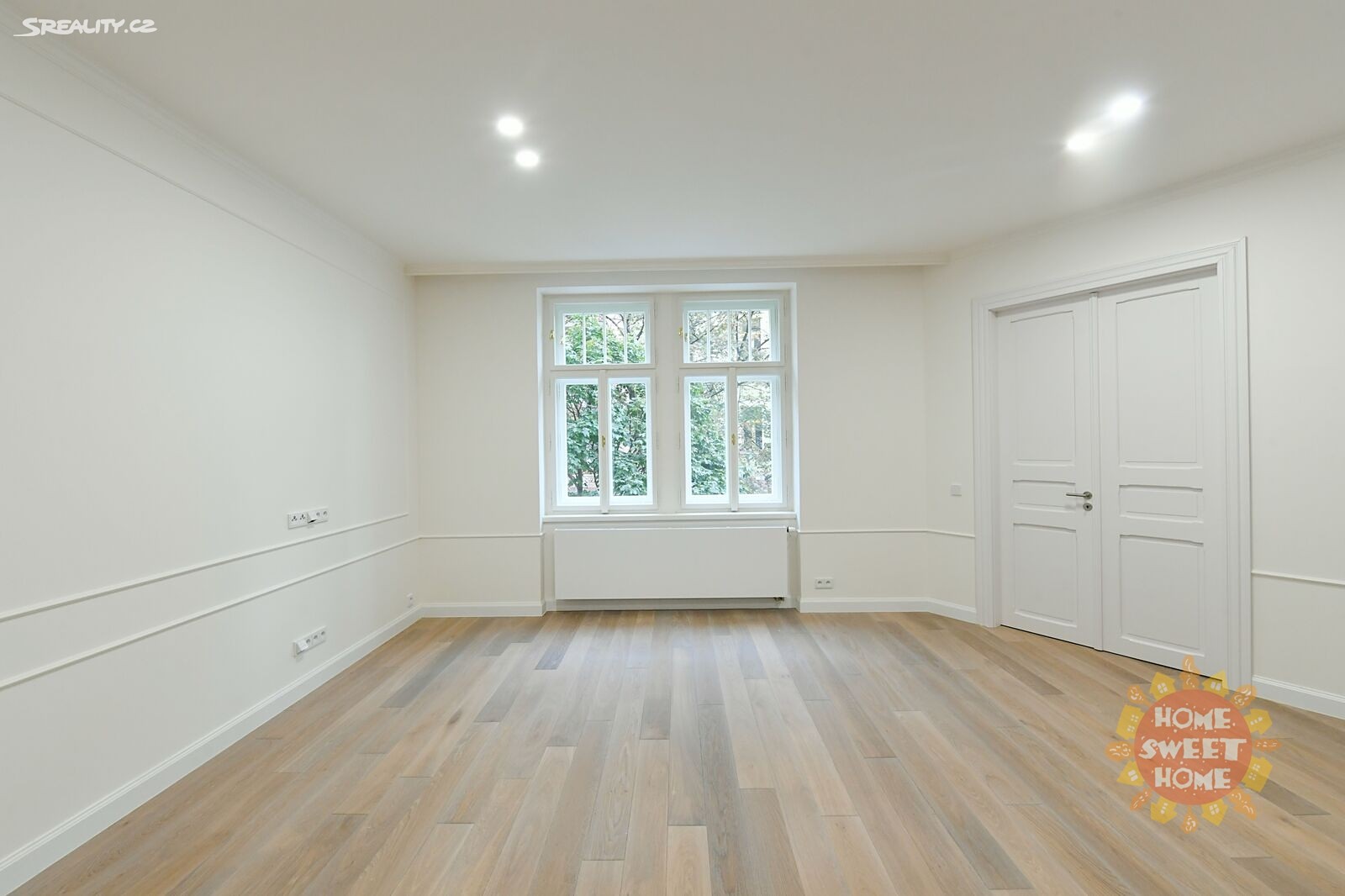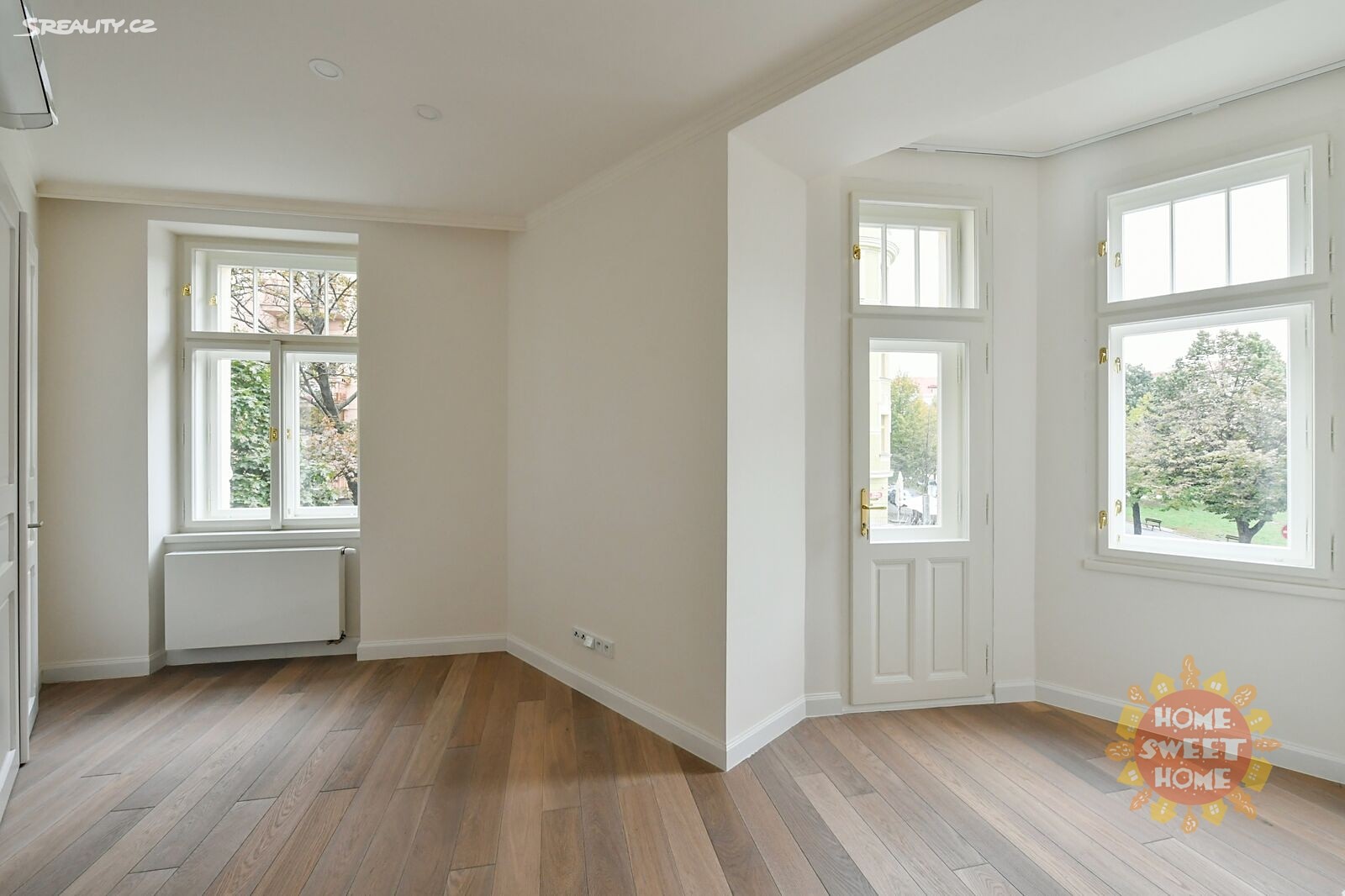 We offer for rent an unique, renovated, spacious 4kk apartment (118 sqm + 2 sqm balcony). This high-standard unfurnished apartment is located on the second above floor of a carefully renovated Art Nouveau apartment building with an elevator in the popular Prague neighborhood of Vinohrady, on Náměstí Jiřího z Poděbrad Street.