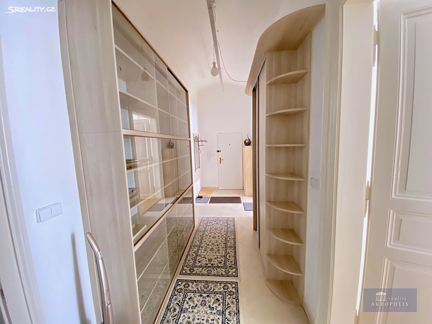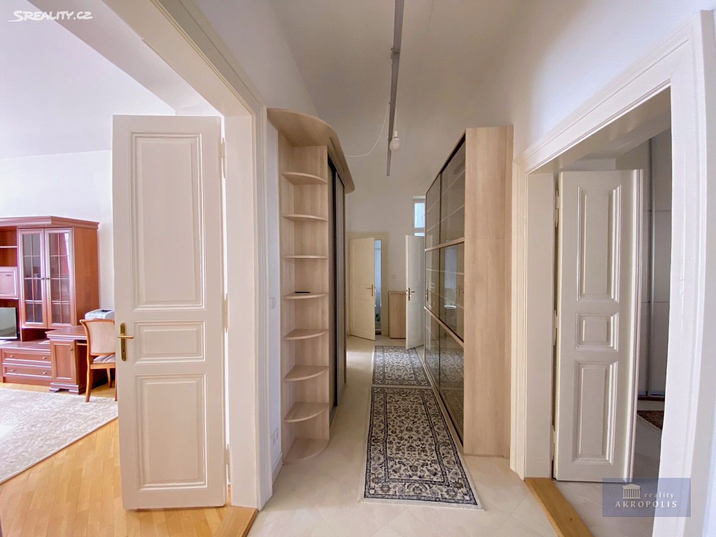 The apartment offers generous storage space thanks to built-in wardrobes. Located on a higher floor, it is very bright, with windows facing east and west. The hallway features a large bookcase, suitable for storing books or displaying decorations. Overall, the apartment provides elegant living in the center of Prague with full amenities and the option to customize the furnishings by agreement.