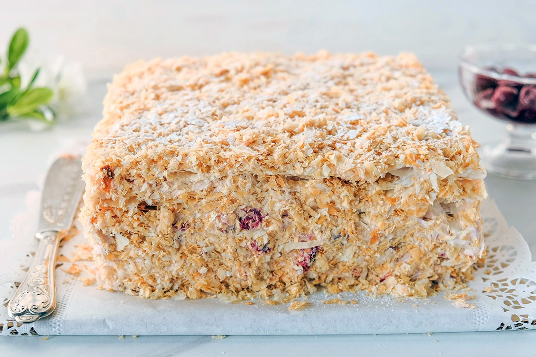 Кроме «Наполеона» в классическом исполнении с заварным кремом, в ассортименте также есть версии со сгущенным молоком, вишней, малиной, бананом, фисташками и маскарпоне.