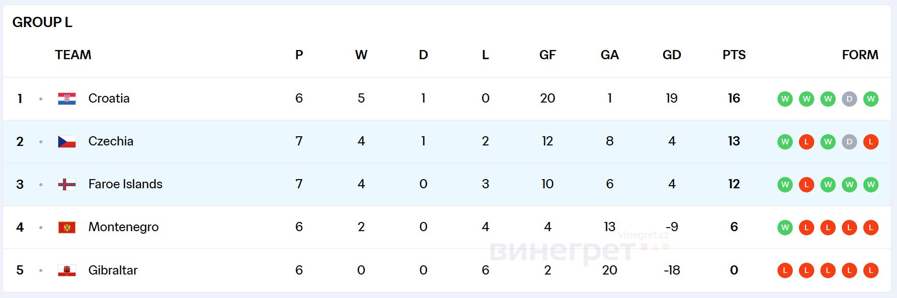 Вместе с тем в нынешнем отборочном цикле сборная Фарерских островов не похожа сама на себя, демонстрируя уровень неуступчивого середняка. Команда впервые в истории одержала три победы подряд, одолев Гибралтар (1:0), Черногорию (4:0) и теперь Чехию (2:1).