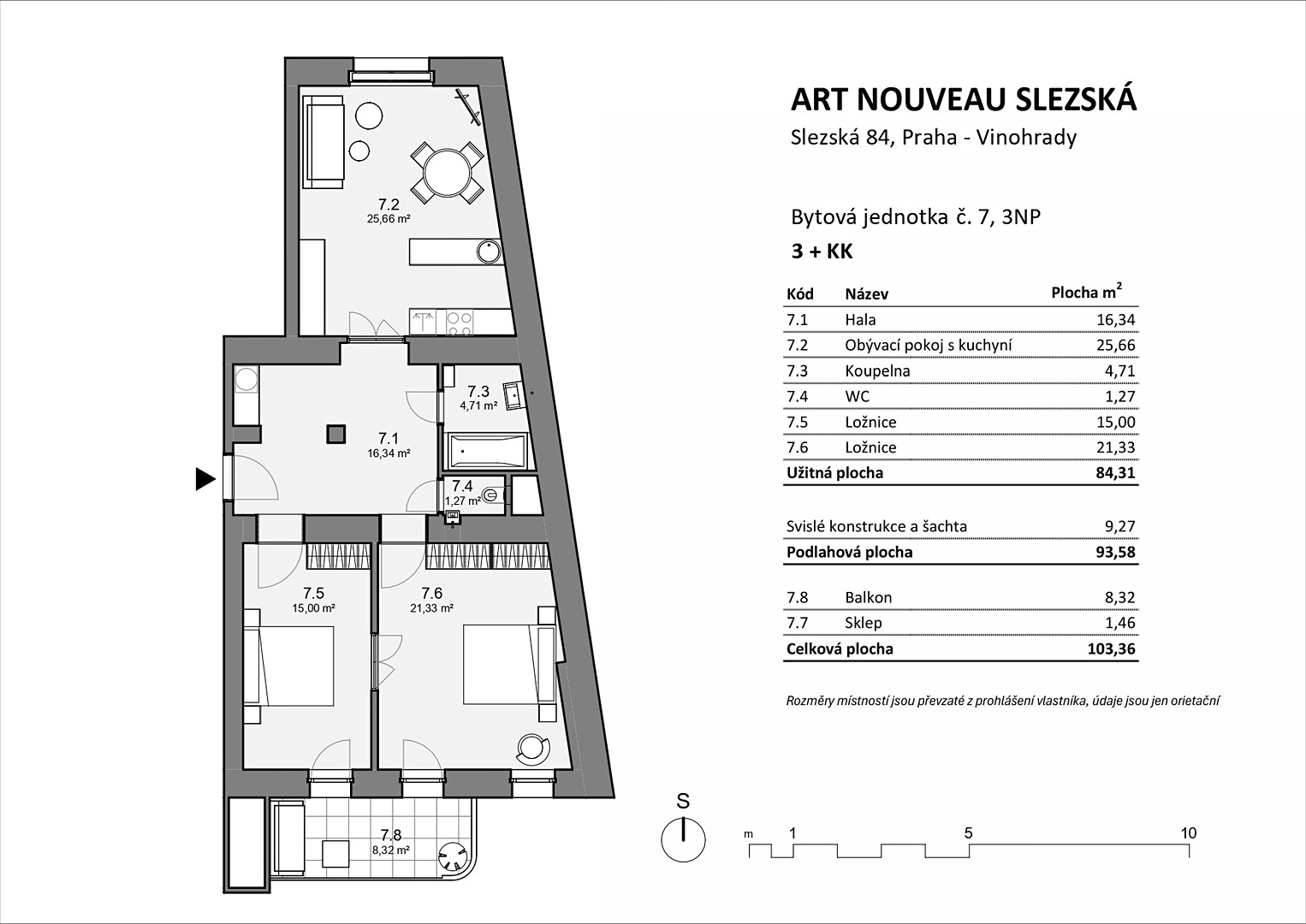 Продается трехкомнатная квартира 3+kk площадью 94 кв.м с балконом 8,32 кв.м и кладовкой 1,46 кв.м в Праге 3 – Винограды (улица Слезска).